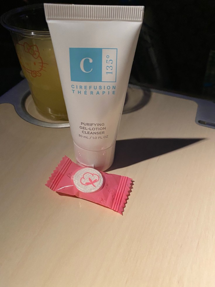 My newest long-haul flight pro-tip is all about face washing. Of all places, European Wax Center has come out with their own skincare line, including a gel face wash. The gel face wash can go on dry and even be wiped off dry for a complete cleaning! But I also discovered little compressed single-use wash cloths that are about the size of a mint and when you wet them they magically unfold into a wash cloth. Game. Changer. It was so awesome being able to wash my face so easily mid-flight!