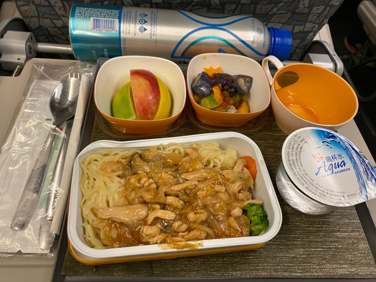 I was giddy from the moment they handed out the menus since the back cover says, “It’s time for an adventure!” I love my adventures. The flight included two meals and snacks. The first meal was served pretty soon after getting in the air and was delicious. This “Sky Gourmet” meal included a smoked salmon and grilled scallop appetizer, salad, curry chicken, fruit, and ice cream. The chicken curry I would seek out to order in a restaurant if I could. And the ice cream, yes, it was just a little cup of Haagen-Dazs vanilla ice cream, but I can’t even remember the last time I ate a full-fat ice cream, it was divine. Drink service also started pretty shortly after take-off. I’m pretty sure I went through three glasses of sparkling wine in the first hour of the flight. It was so good! Brandon even liked the whiskey they served. I asked our steward how to say “Thank You” in Chinese and spent the rest of the flight practicing it every time he came by. My “Thank You” game is pretty strong now!