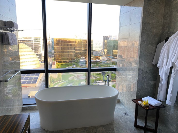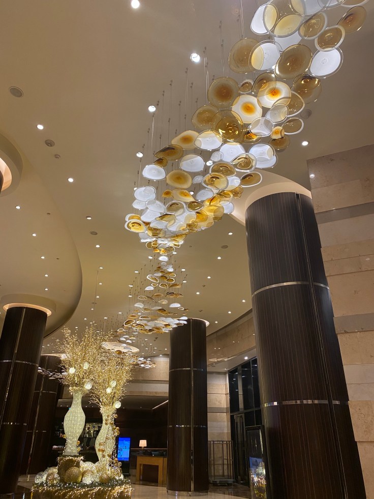 We grabbed a cab and made it to our hotel for tonight. Noting heavily armed law enforcement at the gas stations and throughout our short drive. Tonight we are at Hyatt Regency Manila City of Dreams. I picked it because it was close to the airport and I could use points. I had no idea that this area is like the Vegas of Manila and the hotel was a giant casino. Our taxi driver stopped short of the hotel entry for “inspections.” Inspections? Before I could even ask what the inspections were all about he popped the trunk and an armed guard with a dog did a quick once over. Interesting. After getting cleared he pulled the extra 20 feet up to the hotel entrance and we hopped out. A bellman came and started grabbing our bags. I told him we didn’t need help and he replied that he had to take them to x-ray them before we could go inside. Excuse me? Yup, every item we were bringing in had to be x-rayed and we had to walk through a metal detector and get a light pat down before being allowed inside the hotel doors. I’ve never had a Hyatt welcome quite like that before! The hotel is very nice with a beautiful lobby and a spacious, clean, stylish guest room. We are here for a whopping 9 hours and then we head back to the airport to catch our short flight to El Nido tomorrow morning. Will be writing from the resort every night but not sure WiFi will be good enough for uploading.