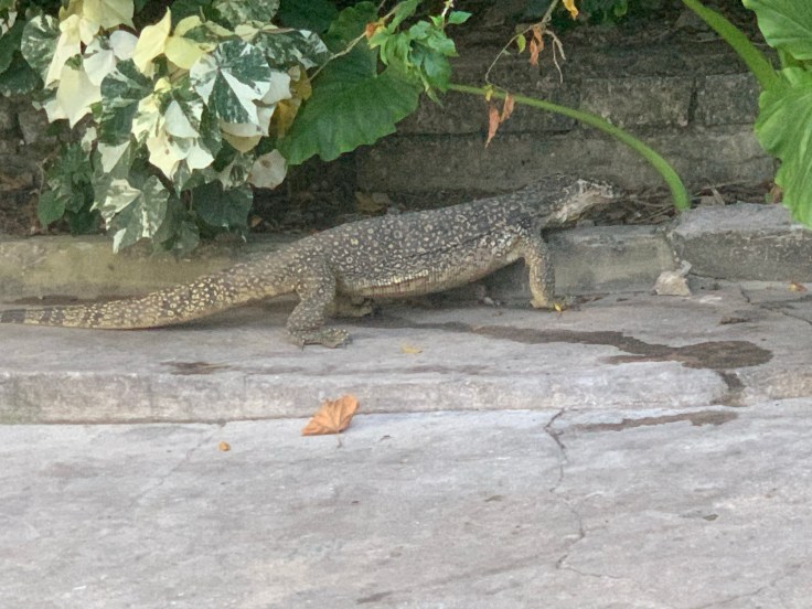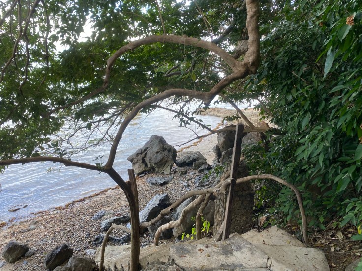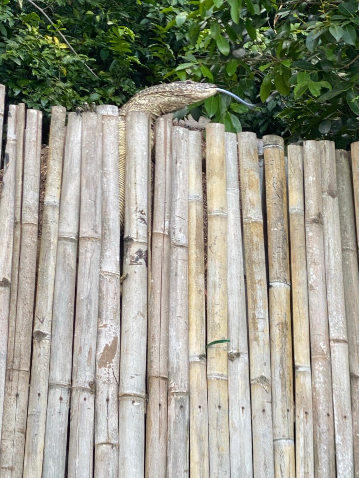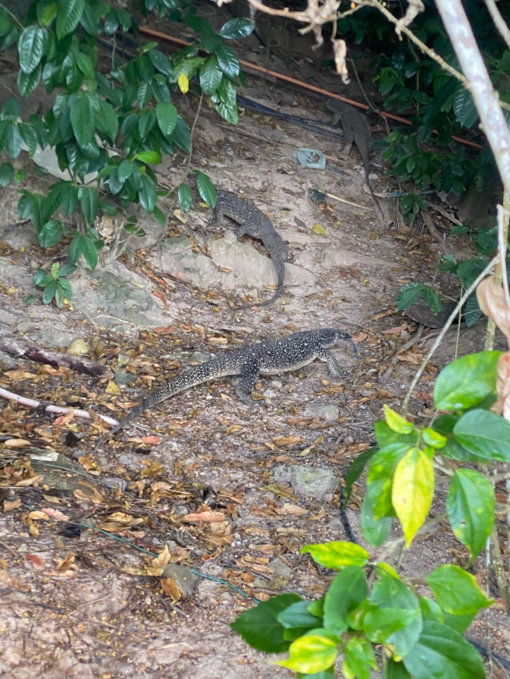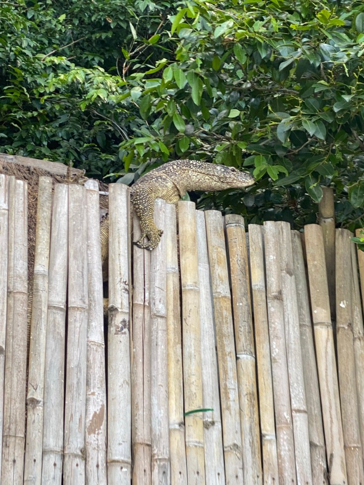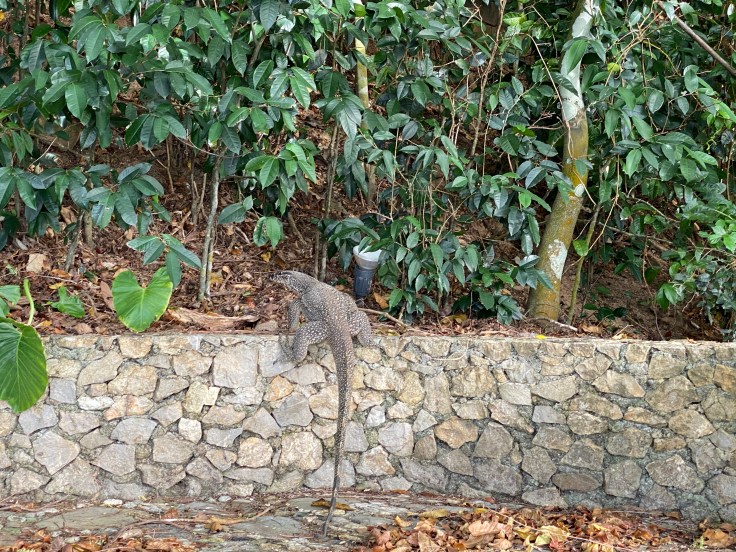 We walked back across the resort and stopped at the open-air lobby to ask the activities desk about the hike that was mentioned in our guide, the lady replied that she could look into a guide for us and seemed confused when we clarified that no, we wanted to know where the one we could do on our own was. “Oh, yes, you can just walk along the cottage paths.” Not helpful. Not at all. We walked up the North path back to our cottage and stopped in to take our malaria meds and vitamins. I suggested that we continue walking down the path just to see where it goes, maybe we’d find the trailhead. We walked past the last 8 cottages and sure enough, the path kept going. Maybe we had stumbled upon it! The morning air was warm and thick and the sun was starting to peek out of the clouds from the ocean. We came across another monitor lizard, larger this time, closer to six feet, and it jumped up the retaining wall to get away from us. His stocky, thick thighs were quite impressive.