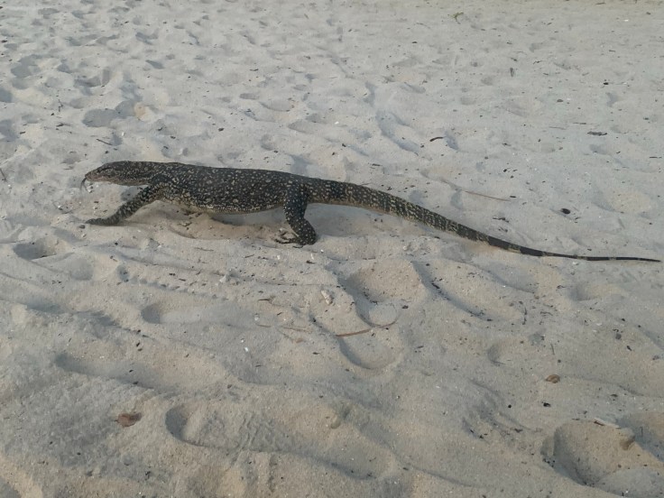 Happy Hour was upon us so we ordered a couple cocktails and relaxed on chairs on the beach. I was still in a damp bikini and it was quite uncomfortable. The gin in my White Egret cocktail helped a bit, but not enough. As we sipped our green cocktail and reflected on our day and how surreal it still felt to be there it sounded like we went alone anymore. Sure enough, another monitor came stalking behind our chairs. These dudes are everywhere!