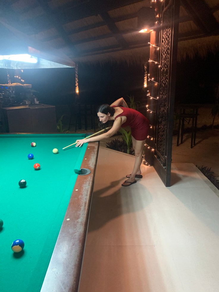 Knowing we were probably dehydrated from our day, we next ordered two fresh coconuts to drink. They weren’t as good as fresh coconut water I’ve had in Costa Rica and Cuba. They were a little bitter and seemed like maybe they’d been watered down. It was hot and sticky out, and being in a damp bikini was crazy annoying so a dip in the pool was in order. I tried to practice my newfound floating and swimming skills and was disappointed that without the help of the saltwater keeping me buoyant, I again was more of a sinker than a swimmer.