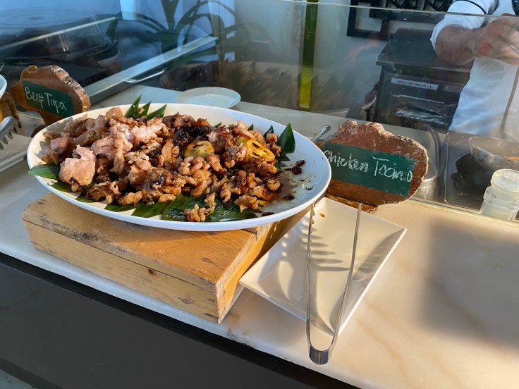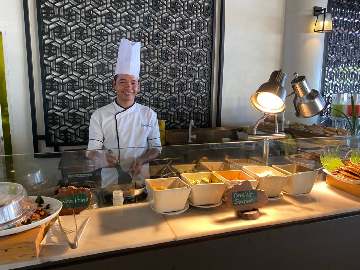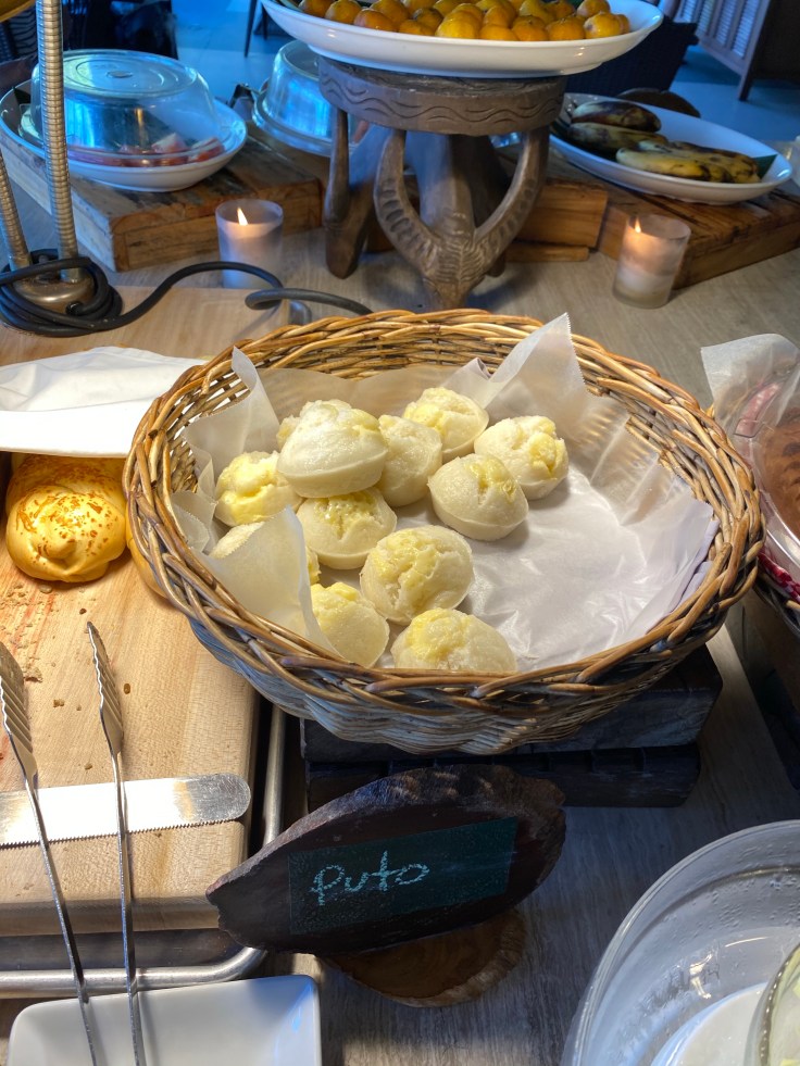 Breakfast service here starts at 6:30 so we figured we might as well get a start on our day. I threw on some shorts and a tank top and we walked the little path to the restaurant/lobby area. Along the way we heard rustling beside us and there we saw our first water monitor lizard. This thing was at least five feet long and slowly lumbered away as we approached. We had read that there were monitor lizards here and I was excited that we actually saw one. Breakfast was a delightful spread with many dishes that we would consider non-transitional breakfast items, like chicken and salad. The chicken tocino and puto bread made my taste buds happy and were a wonderful accompaniment to my omelet.