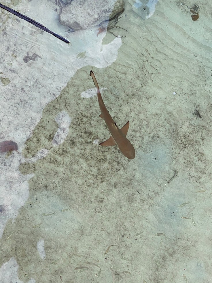I was definitely more impressed by breakfast this morning than by last night’s dinner. By 7:30am we had full bellies and wondered, “what now?” I really wanted to walk off breakfast so we decided to try to find the nature hike that was mentioned in our activities guide. We walked down the South path from the restaurant and found ourselves at a dead-end, nothing but cottages and steps into the sea. Sea urchins were everywhere and Brandon really wanted to eat one. A baby black tip shark swam past us. I love sharks!