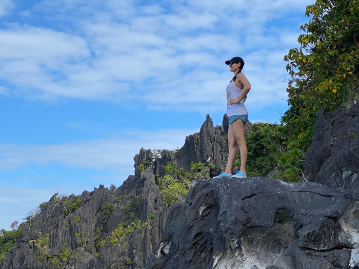 Excitedly we walked along the beautiful white sand in awe of the gorgeous turquoise waters surrounding us, and the fact that there was not another sole in sight. The gorgeous narrow stretch of sand actually had a row of three huts with chairs. Large rocks jutted out of the sand seeming to mark the end of the gorgeous stretch of abandoned beach, and being me, I scrambled to climb them. They weren’t tall but slippery and jagged. And worth it. For on the other side I could see there was a small section of white sand beach nestled against the rocky cliffs, and seemingly calling our names. It was warm and the water was gorgeous. We needed to get in that water. But I hadn’t changed into a bikini yet. I was still in my shorts and tank top from breakfast. We had to improvise…