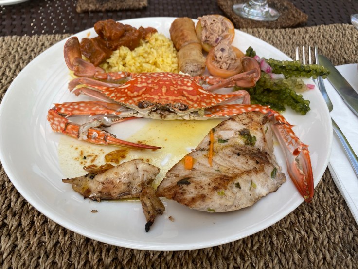 Having worked up an appetite again we were excited to find how good the lunch was. We filled up on steamed blue crabs, turmeric rice, beef something, pork egg rolls, tuna bites, chicken, and the most delicious seaweed salad unlike any I’ve ever had. These pieces of seaweed were comprised of little bulbous buttons, and I loved it. After lunch we rushed back to our cottage to grab a few necessities as our boat and crew were waiting at the dock for our four-hour private island tour.