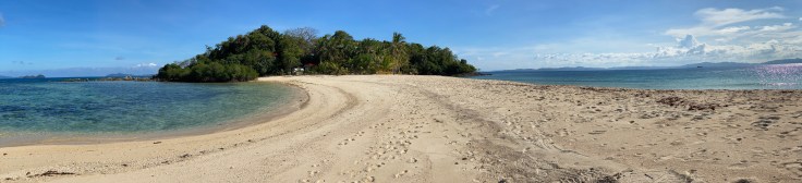 I saw a white sand bar come into view and knew right away that what I was seeing must be Isla Blanca. This little island must be a popular tourist stop as it was stocked with tables, chairs, and a couple little huts. But aside from one lone guy, who must have been the island caretaker, and must live on there since he had two dogs with him (I guess they could boat too but these islands aren’t exactly meant for commuters), and of course our crew, we had the entire island to ourselves. Raul set-up chairs for us and produced a juicy fruit plate while we selected beers from the cooler and stood in awe of the breathtaking scenery. We waded out into the shallow waters and discussed how good life is and how amazing it is to see the world. This was our own little oasis. The crew was napping on the outrigger and the caretaker dude made himself scarce so we were truly alone. Feeling completely alone on a tiny island, in the middle of the sea, in a country over 6,000 miles from home. Just wow.