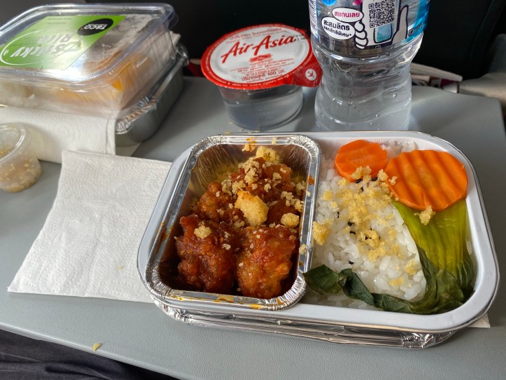 Thankfully the walk between the terminals was short and we made it in time to get our luggage checked in before the baggage check-in window closed. Security lines were short and we made it to our gate with a full ten minutes to spare before boarding. Don Mueang is the older of the Bangkok airports and it was obvious. Parts of it literally smelled like a cat litter box. Today we flew AirAsia. Thankfully the flight to Krabi is short, only about 90 minutes, cause this plane was not meant for anyone over 5’ tall. The legroom was non-existent, we both sat with our knees pressed up against the seats in front of us. We had ordered upgrade meals when booking, only because it made it seem like everyone got a meal so I thought it’d be best to pick our food at least. But in fact, I was wrong. Meals were only served to those who ordered, and there weren’t many of us. The menu was extensive though and we had selected a pad thai for me and a spicy beef for Brandon. Plus mango sticky rice. Our meals also came with vegetarian fried rice that we were not expecting. We each had one spoonful of rice. No good. Brandon’s meal was decent but my pad thai was at the same time bland and spicy. However, I will say it was better than the flavorless crap we had on our way to the FloatHouse. The mango sticky rice was delicious. I could’ve polished off ten packages if given the chance!
