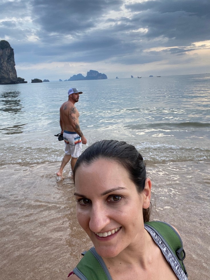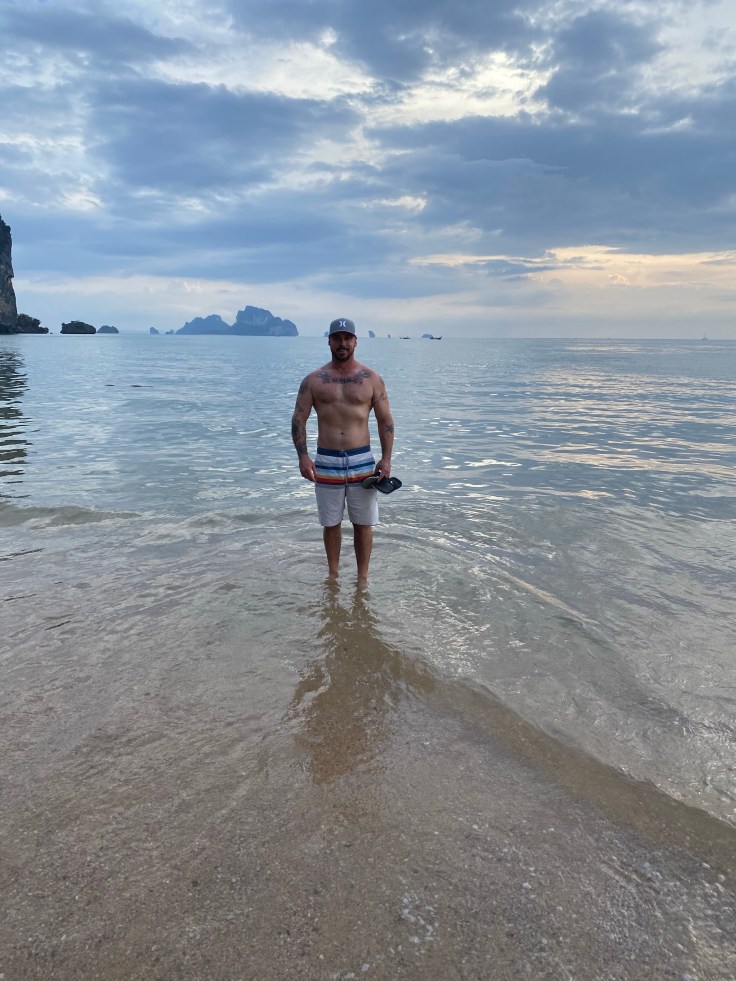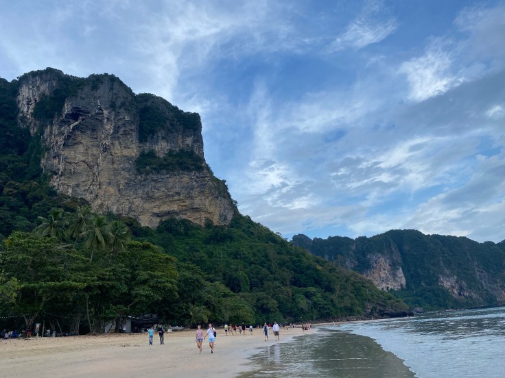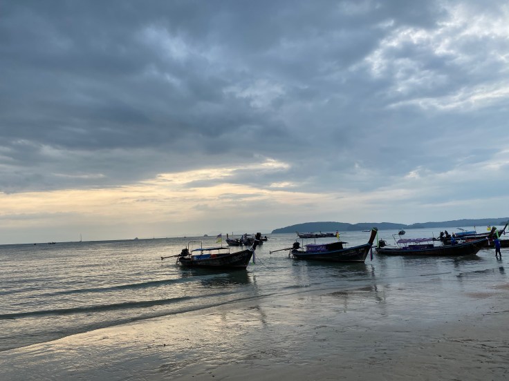 Neither of us were loving the feeling of the area and finally making it to the water did not make it any better. The beach was littered with people and long boats polluted the water. Badly. As the water lapped onto the sand you could literally see oil swirling in the shallows. Walking down to the far end of the beach we finally found an area with less people and clean water. The surrounding mountains and islands off in the distance are beautiful and provide some enchantment but the water seemed dark and not even close to blue. Part if may be our exhaustion but we were over it.