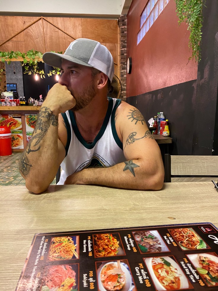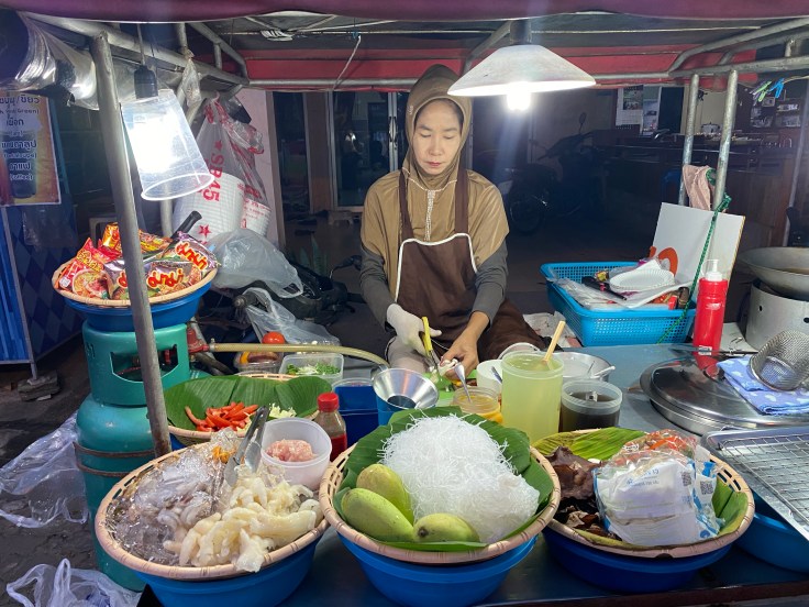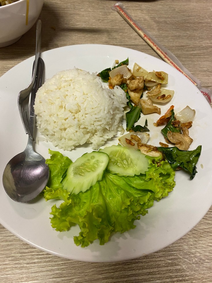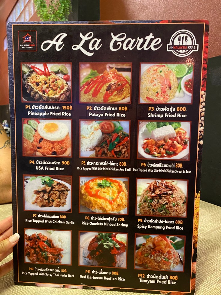 We were also hungry. But not wanting to be caught up in tourist row we decided to put some distance between us and beach before stopping to eat. None of the choices excited us but we really needed food and were nearing our resort so we stopped at a little halal restaurant. Fun fact that I did not know, there is a HUGE Islamic population here. It felt like half the restaurants on the main road were advertised as halal. We ordered garlic chicken and a beef noodle ball. And could not believe how disappointing it was. The menu had pictures that were nowhere near reality. Though delicious, the garlic chicken plate only had five bites of chicken. I’m not exaggerating. The noodle bowl had maybe eight bites of beef and was just ok. The meal was 180 baht, over twice what we paid for full meals our filet night in Bangkok, and was barely an appetizer.
