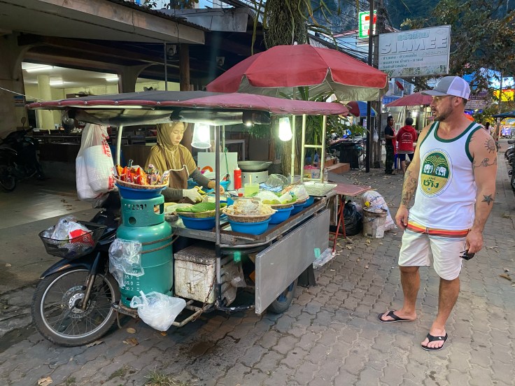 At the turn-off to our resort we saw the first real street food vendors in the area, over a mile up from the beach. We ordered a seafood noodle bowl from one stand and watched her expertly construct our dish as loud speakers from an old building across the street sounded the Muslim call to prayer. At the next cart we ordered a variety of chicken skewers. This should do. We popped into a 7-11 convenience store for a couple cans of beer and bottles of water. Checking out my eyes scanned the shelves and found a marvelous sight. I may have let out my biggest grin of the day as I tugged on Brandon like a little kid and pointed. Right there, on the shelf, a bottle of Domain Chandon Sparkling Rose. It may not be the best sparkling wine but it’s a good one and this was exciting. We hadn’t carried much money with us tonight but we’ll be back for that beautiful pink bottle tomorrow!