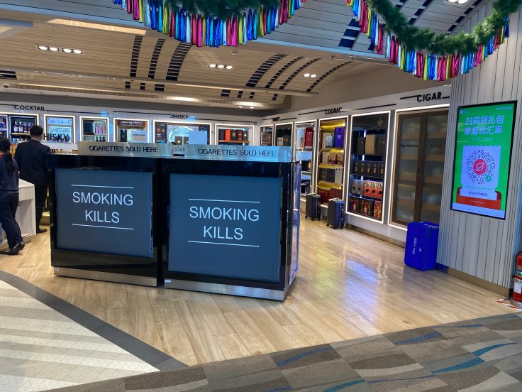 The Cathay Dragon entertainment screen was kind enough to show gate numbers and locations as we were coming in for a landing. Had we not paid attention to the instructions on screen, we would have been screwed as the airline attendant we asked to direct us at the arrival gate pointed us in the wrong direction, opposite of where we needed to go. The Hong Kong airport smelled great and transfer security had a very short line, allowing us to make it to our next departure gate with minutes to spare. There was enough time before they started boarding to grab two bottles of Fiji water and a fresh watermelon juice from a coffee shop adjacent to the gate. I love watermelon juice; I can’t wait until it’s back in season at home so I can go back to juicing it all the time. I didn’t know the Hong Kong currency and had no clue how much it had cost. Pulling up my currency app, I was pleasantly surprised that HK$59 was only $7.57 USD; at any US airport the total would have easily been closer to $20 USD. But then we realized that it was 230 Thai baht and were appalled since in a Thailand airport it would have been closer to 60 Thai baht; it’s going to be quite an adjustment easing back into US costs when we get home. It must have been cold in Hong Kong since we were the ONLY people in the airport not bundled up. Brandon was in shorts and a t-shirt, I was in small shorts and a tank top, and everyone else around us was in pants and sweaters or full on jackets.