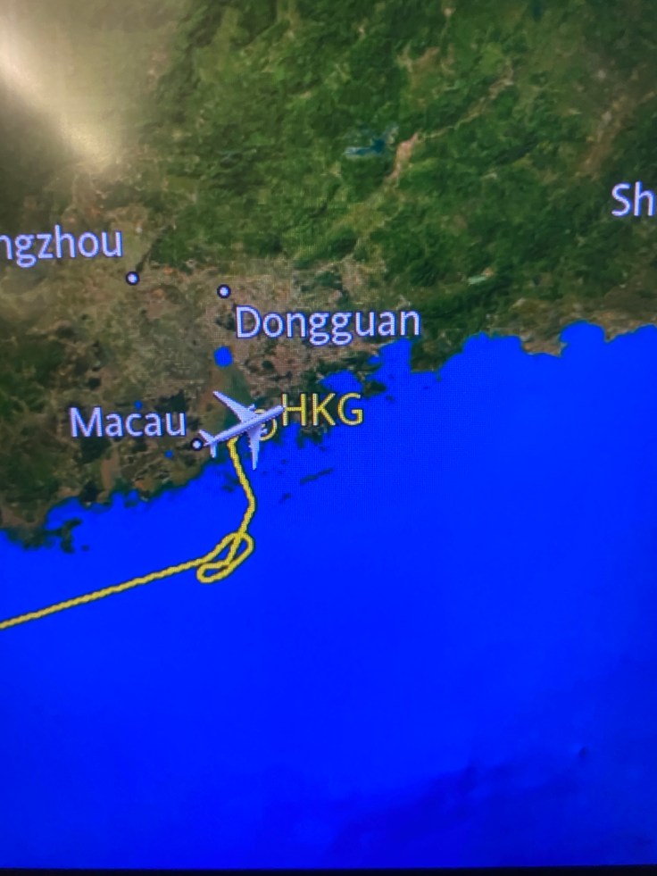 Our layover in Hong Kong was tight, only 45 minutes. When I booked the flight it even came with a warning message that the layover was shorter than recommended for Hong Kong. We had packed our carry-on bags with overnight essentials just to be safe in case we, or our luggage, didn’t make the connection in time. The captain had announced that we’d be landing about 20 minutes early so our confidence levels rose, now we’d have 35 minutes instead of 15 to make it to our next gate before they began boarding. And just as quickly, our confidence sank when the captain announced that due to airport congestion we were in a holding pattern before we could land. And so we circled. And then we finally began our descent, and then circled some more. So much for any breathing room.