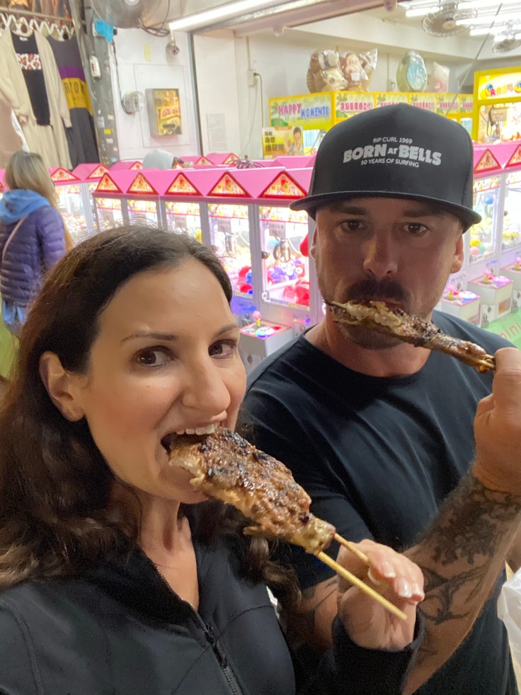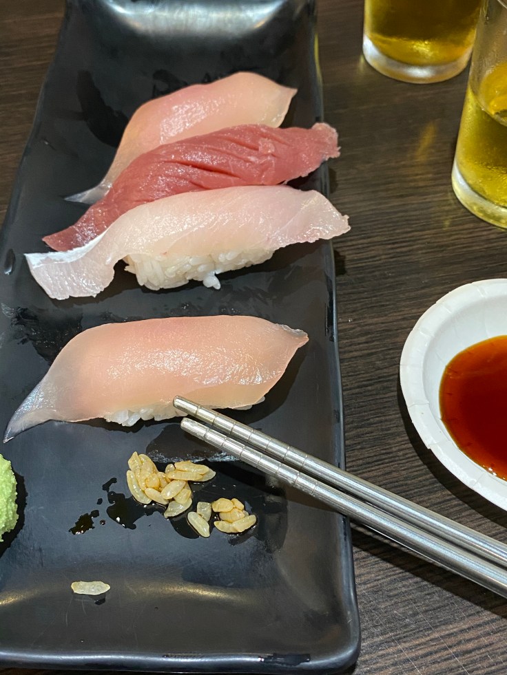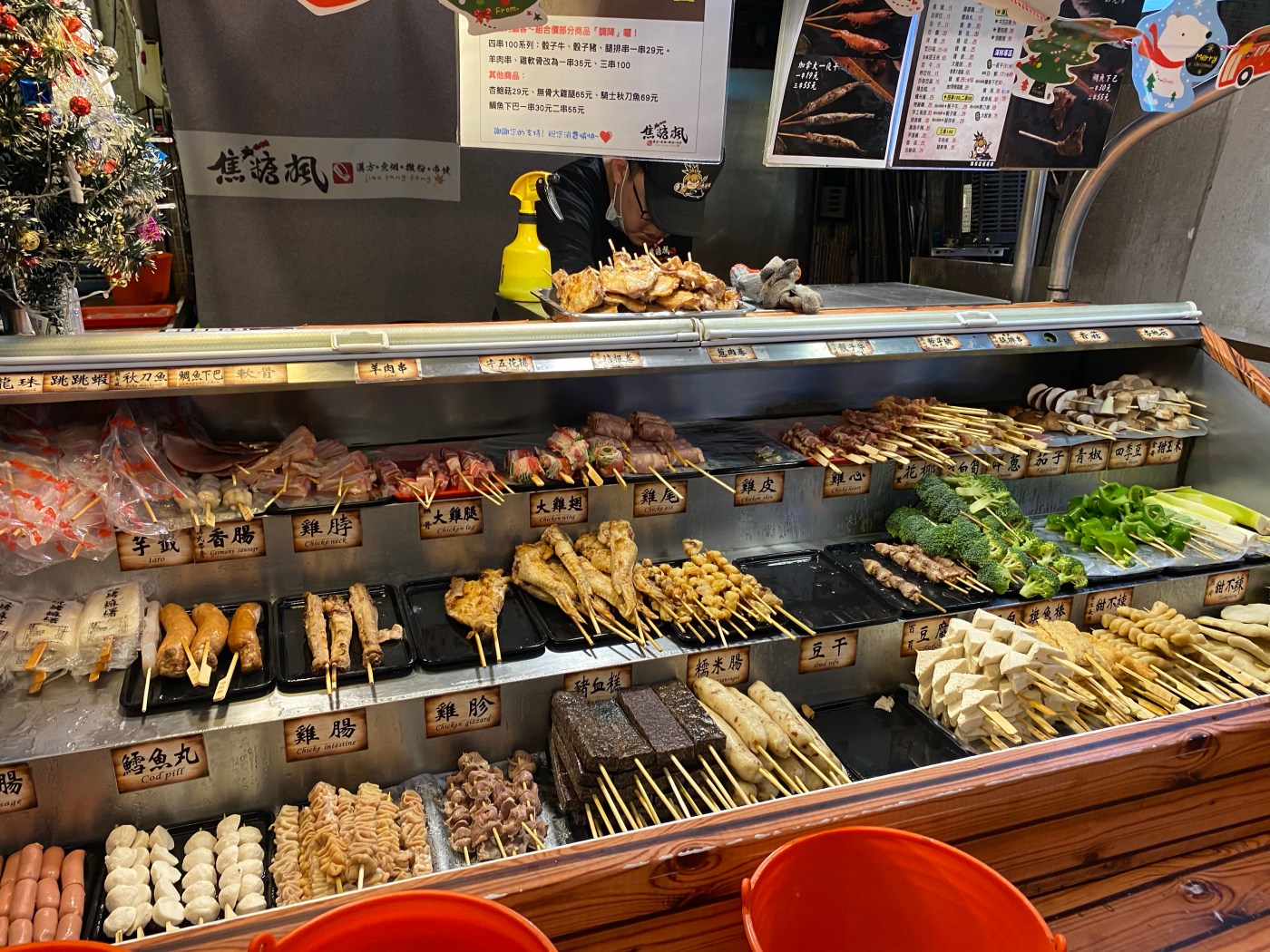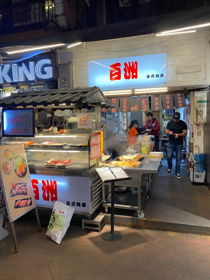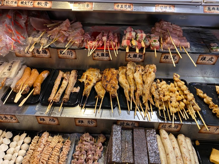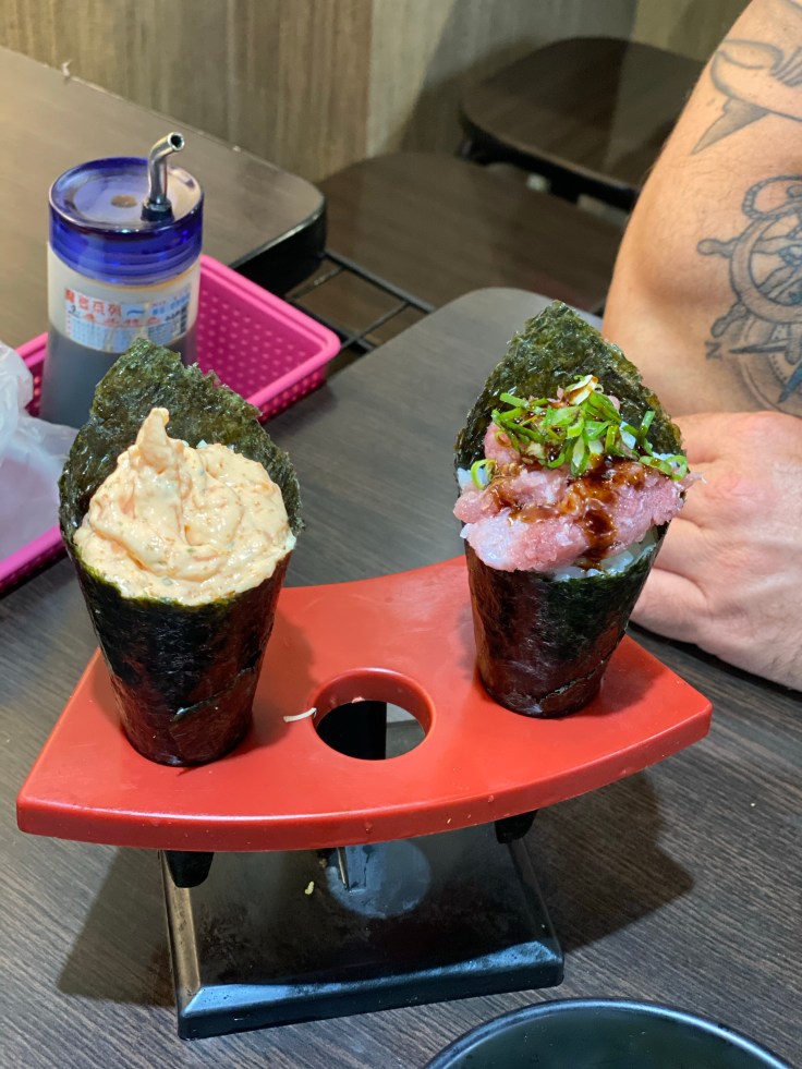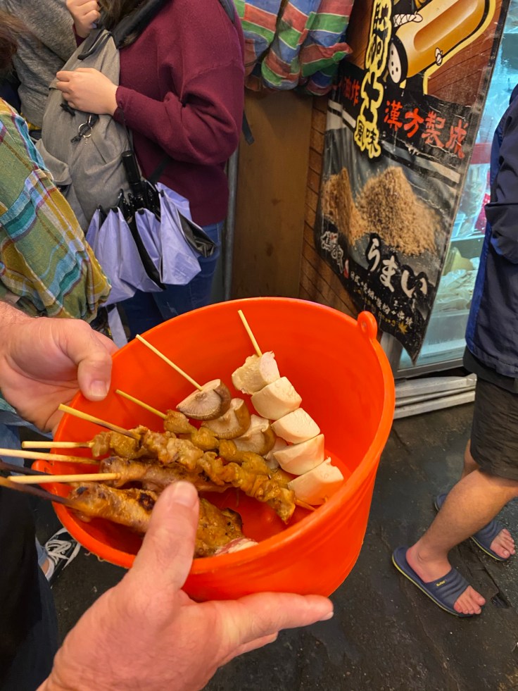 One of the few things we had on our list for Taipei was visiting a night market. After getting settled, cleaning up, and peeling ourselves away from playing with the toilet; we walked down the street to the Linjiang Street Night Market. It was about 10:30pm and we were hungry. And now we had a new language barrier to deal with. A busy vendor had a variety of sticks on a cart. Any and every part of a chicken, beef, lamb, squid, vegetables. It had labels in English and looked good so we were down to give it a go. Buckets were stacked on the front of the cart and we mimicked others; filling a bucket with sticks of interest; chicken legs, skin, and ass; beef wrapped around some green veggie; and mushrooms. We handed over our bucket, paid our TWD$333 ($11 USD), and were told “20 minutes.” What?! We knew the beef was raw and had to be cooked but we figured the rest was just grab and go. It was worth the wait though; when we arrived back at the cart 20 minutes later our taste buds were grateful. Everything had a crispy finish with a sweet salty seasoning and was decadent. Later, we stopped at a small sushi restaurant to complete our meal.