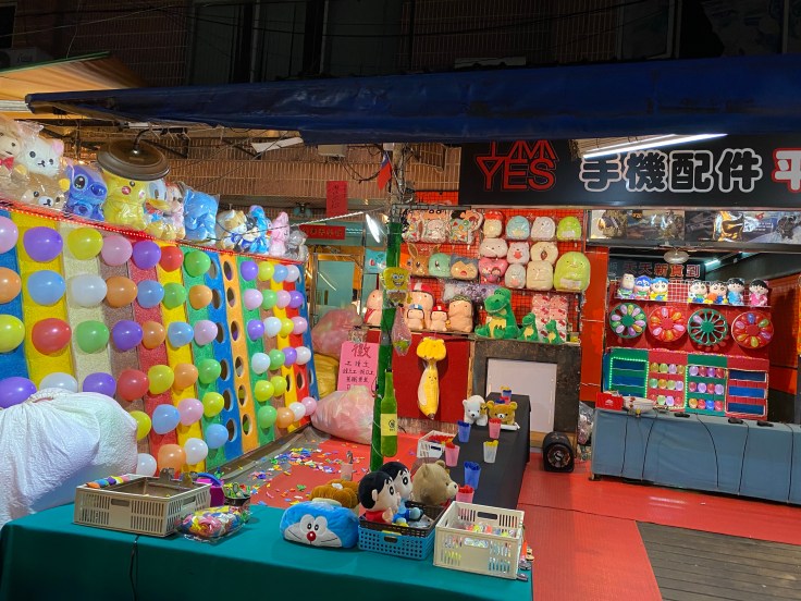 The night market was fascinating. Similar to ones we’d seen in Thailand but at the same time very different. It had a flea market feel but amongst the shops were arcade games and store front upon store front of rooms filled with machines where you’d put in change to get a chotscky in an egg basically. Stores were filled with knock-off brands and oddities. One store was completely dedicated to dog clothing and it made us really miss our babies back home. Following a bathroom sign, we found ourselves wandering down a narrow, but well-lit, alley off a side street until we did indeed find a public bathroom. It felt creepy and I made Brandon come in with me. We almost made it all the way through the entire stretch of market but were forced to turn around when we encountered a nauseating stench. I thought it smelled like a rotten pig. Something was being cooked somewhere and it was about to make me hurl.
