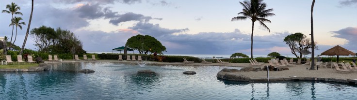Leaving Hanalei, we had grand plans to drive back down from the North, past our resort on the East, and continue all the way down to the SouthWest to see what else the island had to offer. But traffic sucked. At times we just sat. In park. Not moving at all. Just sat. We decided to abandon this exploration and instead spend some time enjoying the resort. We’d been gone about four hours, much of it somehow spent in the car, so we were over it. Though the drive back did offer a couple scenic viewpoints, we were ready to just chill.