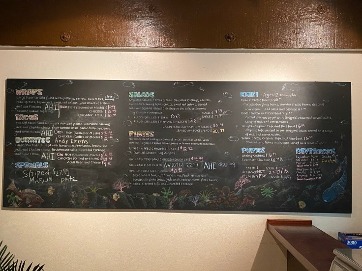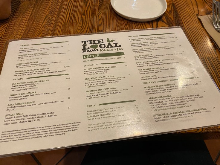 It was early evening and top priority became finding dinner. After consulting my trusty friend, Yelp, we set off to The Local Kauai Kitchen & Bar, a spot just up the road in Kapaa that promised locally sourced and fresh fare. Perfect. It had started sprinkling on us during our drive to the resort and as we set off it started to rain even more. We ducked into a little store next to the restaurant so I could get a new hat and in the few minutes we were in there the rain grew even more aggressive and the wind really picked up. We hurried across the street to The Local and found a group of people huddled in the doorway waiting for tables, yet there were plenty of clean, set, empty tables. They made room for us to step inside too since it was really rainy and crazy windy now and we stood confused for a second trying to figure out the check-in and seating process when a waitress finally came over and told all 11 of us that were huddled by the door that, yes, they have tables open but there is just two waitresses so they are trying to get caught up before seating anyone else. At this point, we should have left, but there wasn’t much else around. As the wind howled fiercely the door to the restaurant started slamming around. Someone tried to pull the door shut but it just flew back open and smacked the wall outside. The waitress showed up and her solution? Her solution was to lock the door, thusly locking all patrons inside and closing it off for anyone else who wanted to enter. As we stood there I kept thinking we’d should find somewhere else but it had been a while now and I felt invested. Plus it was nasty out.