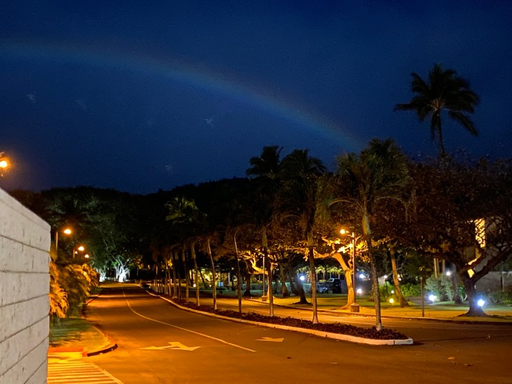 We had grand plans of soaking in the hot tub back at the resort after dinner but the rain and wind thwarted us. Instead we stopped at the grocery store on our way back for beer, hard seltzer’s, water, and breakfast snacks and decided to call it a night. The full moon cast a bright glow on the resort grounds and as we walked back across the parking lot I saw something that I had never seen before, a night rainbow! Yes, in the dark a little bright arc could be seen across the sky. So cool. Cozying up in our room we could hear a great lullaby of crashing waves, fierce wind, and pouring rain.