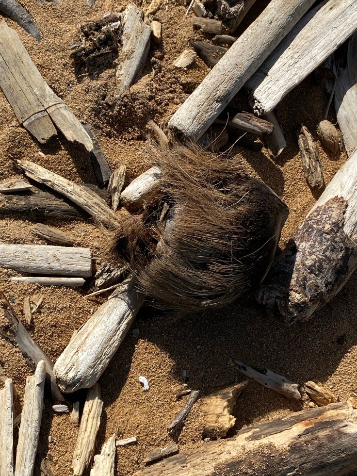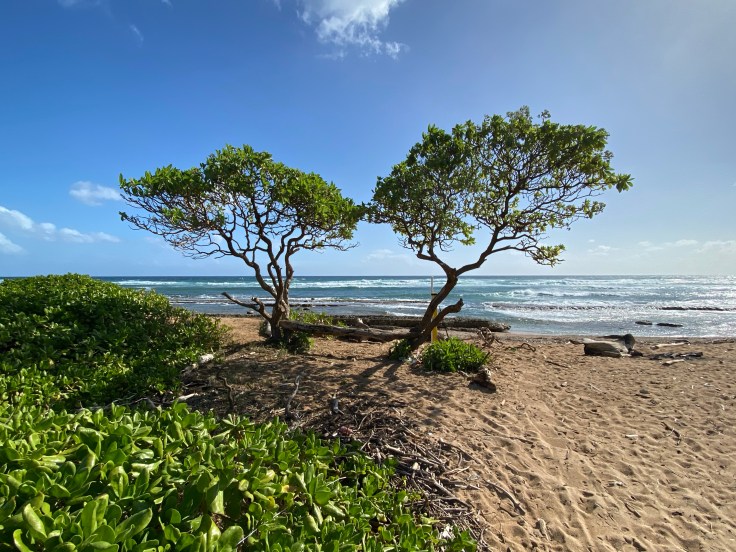 Bright and early the next morning the roosters started to crow. We could have gotten over them but also bright and early loud children started running up and down the hallway yelling. A lesson in how paper-thin the hotel room door really was. It was like having a little hellion yelling right in our room. Annoyed from our sleep, we decided it was time to wake up. We set no real itinerary for this trip so lazy mornings were in order. I was able to pull out my laptop and do some work while sipping my morning tea in bed. Brandon went down to the hotel gym and after I was caught-up with work I put the laptop aside and took a morning stroll along the beach. The sun was out and I had the sand to myself as I walked almost all the way down to the end of the beach and back. I couldn’t help but be amused by the furry coconuts nestled amongst the driftwood, looking like they were wearing bad toupees.