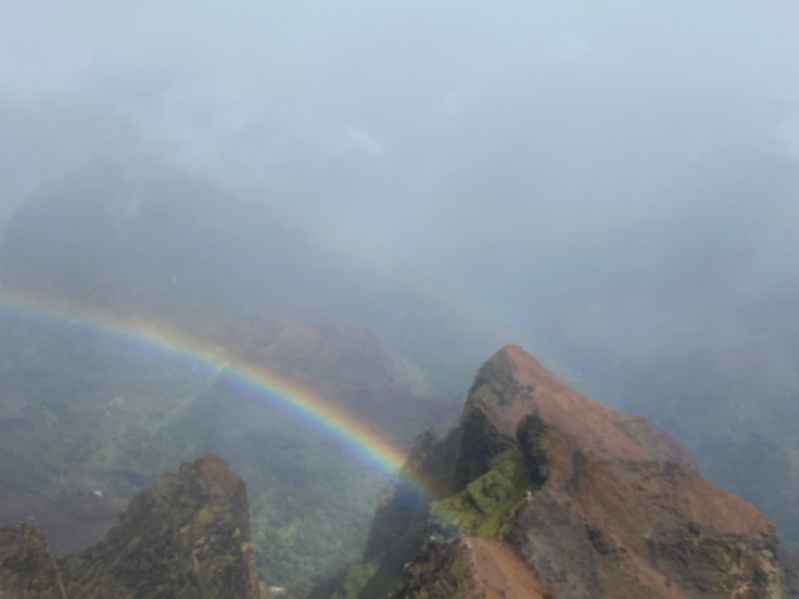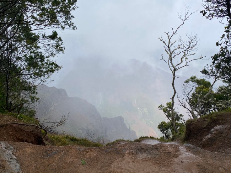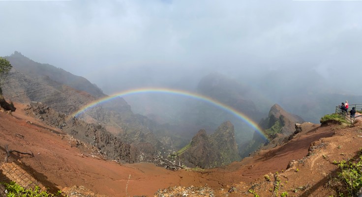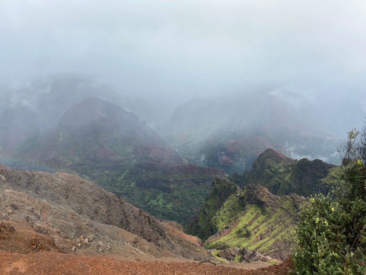 By the time we made it to the main viewpoint and starting points for hikes, the weather had turned miserable; cold with pelting rain. And so cloudy. The canyon could barely be seen anymore because it was filled with clouds. Water rushed down the road and formed pools at every low point. We weren’t prepared to hike in this. Not at all. My Kauai hiking dreams were officially dashed. We settled for a quick jaunt around the viewpoint, waiting for a time when the rain died down for a couple minutes, and given the beauty we could see even amongst all the clouds, I can only imagine how amazing it must be a on a clear day. A perfect rainbow arched across the canyon; reminding me that even with my disappointment in not being able to do any hiking that we were still someplace magical.