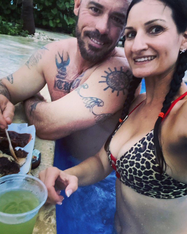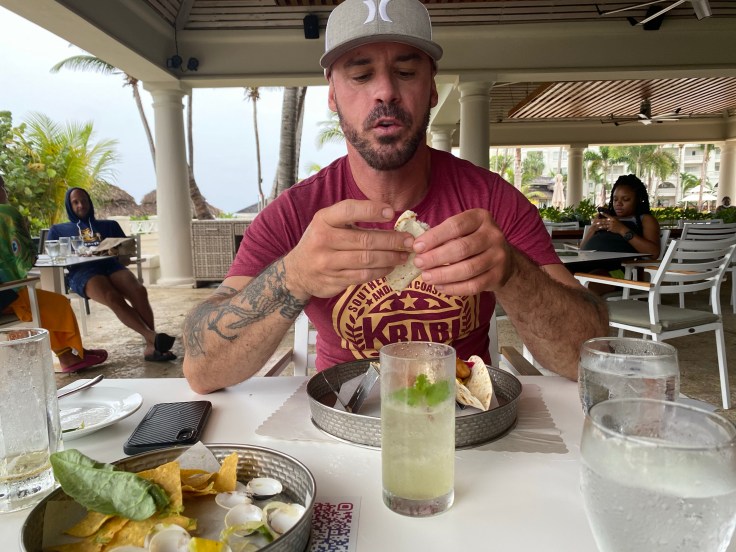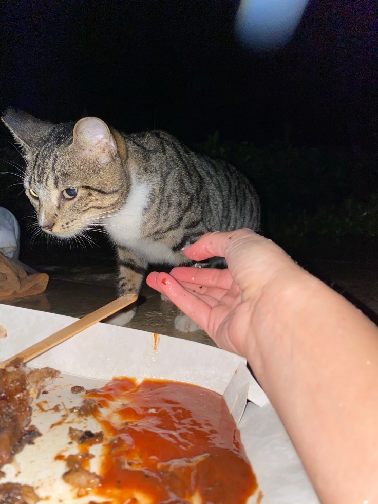 A quick change into swimwear and it was time to sit in the hot tub; it was still raining and the wind was whipping. Barefoot Jerkz was open and we were quite content sitting in the hot tub, drinking mojitos, and eating freaking phenomenal jerk chicken! A little stray kitty ran past, we shall call her Fifi. I earned Fifi’s trust enough to come close and eat chicken out of my hands. Fifi’s confidence built to the point where she stole an entire piece of chicken off the plate and ran off to devour it. More power to her; Fifi will not go hungry as long as I’m here!