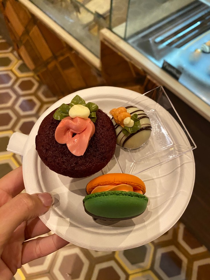 The rain stuck around as we carefully walking along the pool deck onto the overwater gazebo. A couple drinks in and another in hand it felt lovely despite the rain and clouds. Vacation relaxation was setting in. We wondered the property to find more food outlets and ended up in the onsite duty-free jewelry store where they tried to sell us very beautiful, but very lab created, jewelry for way too much. Next door we found Bitez, the dessert shop and shared a subpar cupcake, terrible macaron, and eh rumball. Not impressed.