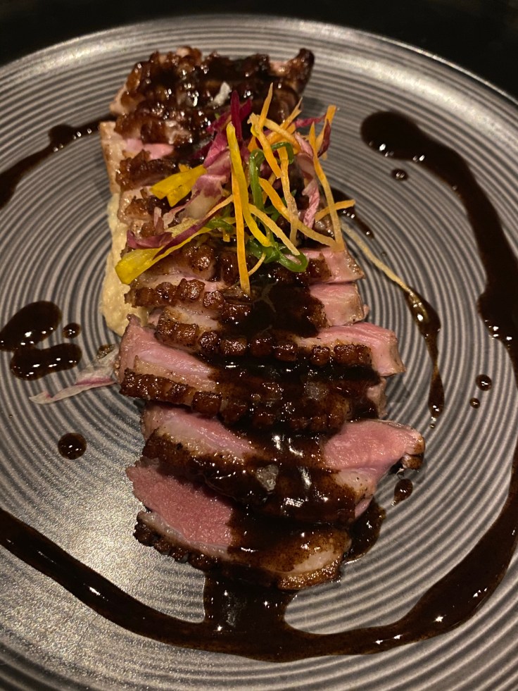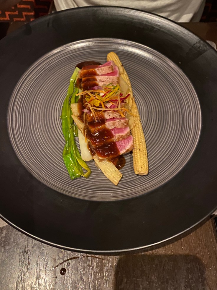 Dinner the Asian fusion restaurant, Fuzion, was pretty good. The portions are definitely smaller than the Hyatt Ziva PV but for the most part it was very tasty. Despite feeling like our presence was again burdensome. We had “assorted sushi rolls” which were lame, one piece each of three different roles, and one of them was vegetarian, followed by spring rolls, marinated mushrooms, siracha-honey glazed chicken lollypops (YUM), and then our main courses of seared tuna and duck breast.