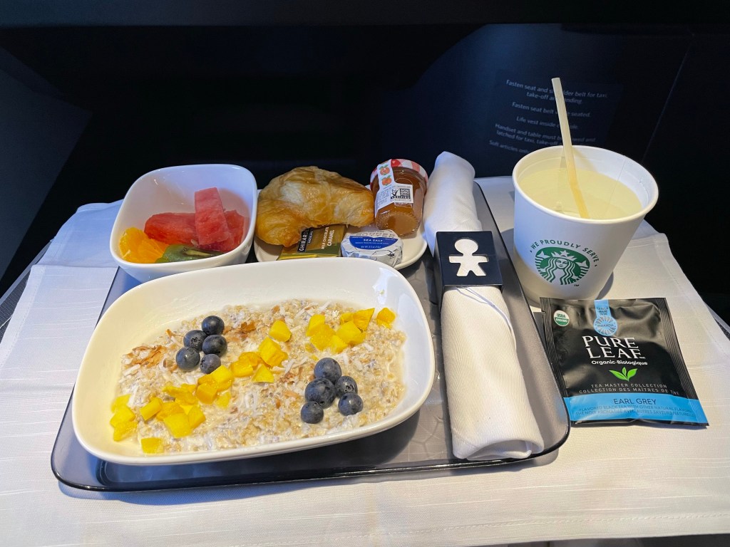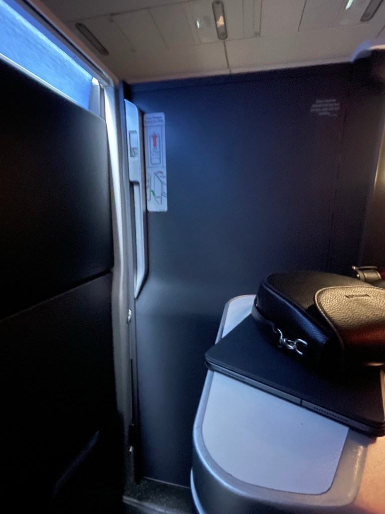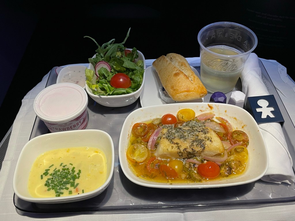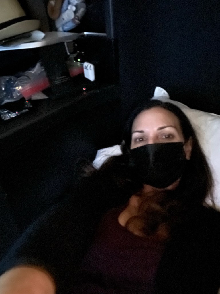Pretty shortly after take off, dinner was served. I selected the Chilean sea bass, served with corn chowder, salad, bread and butter, and a glass of bubbles. It was delicious. Better than any restaurant fish I’ve ever had. The entire meal was great and not a morsel was left behind, except for the strawberry ice cream because sugar and dairy were the last two things I needed if I wanted to sleep. After dinner I washed my face (European Wax Center gel face wash is THE BEST, does not require water and is perfect for traveling), brushed my teeth, made my bed (yeah, on Delta they don’t do it for you like other airlines but that could have just been a COVID adaptation), and actually managed to get about 4.5 hours of sleep. I felt like I could have slept longer but they were coming around with breakfast service and there wasn’t a ton of flight time left. I don’t take for granted that being dressed perfectly in comfy clothes was a big part of why I was able to fall asleep. I stood up to go use the restroom and found myself stuck in my pod. Yup, my little door wouldn’t open. Stuck. The flight attendant couldn’t get it either. I wasn’t desperate to get out so she brought me my breakfast, passing the tray to me over the top, while they figured it out and were able to free me. Breakfast was a meusli with fruit, croissant, and a tea. The croissant was ok but the meusli was superb. I freshened up with another face wash (another staple this time, cetaphil face wipes for a gentler cleanse in the morning) and a clean face mask before making sure I was ready for landing.