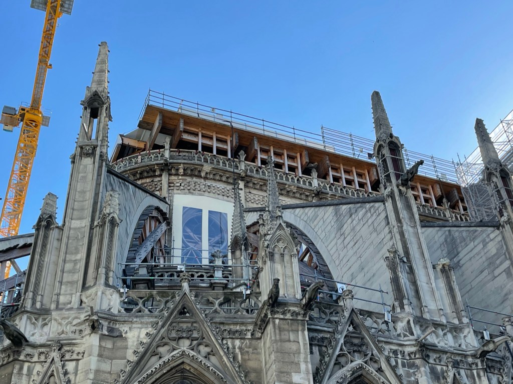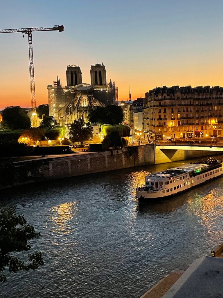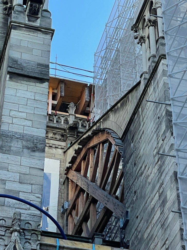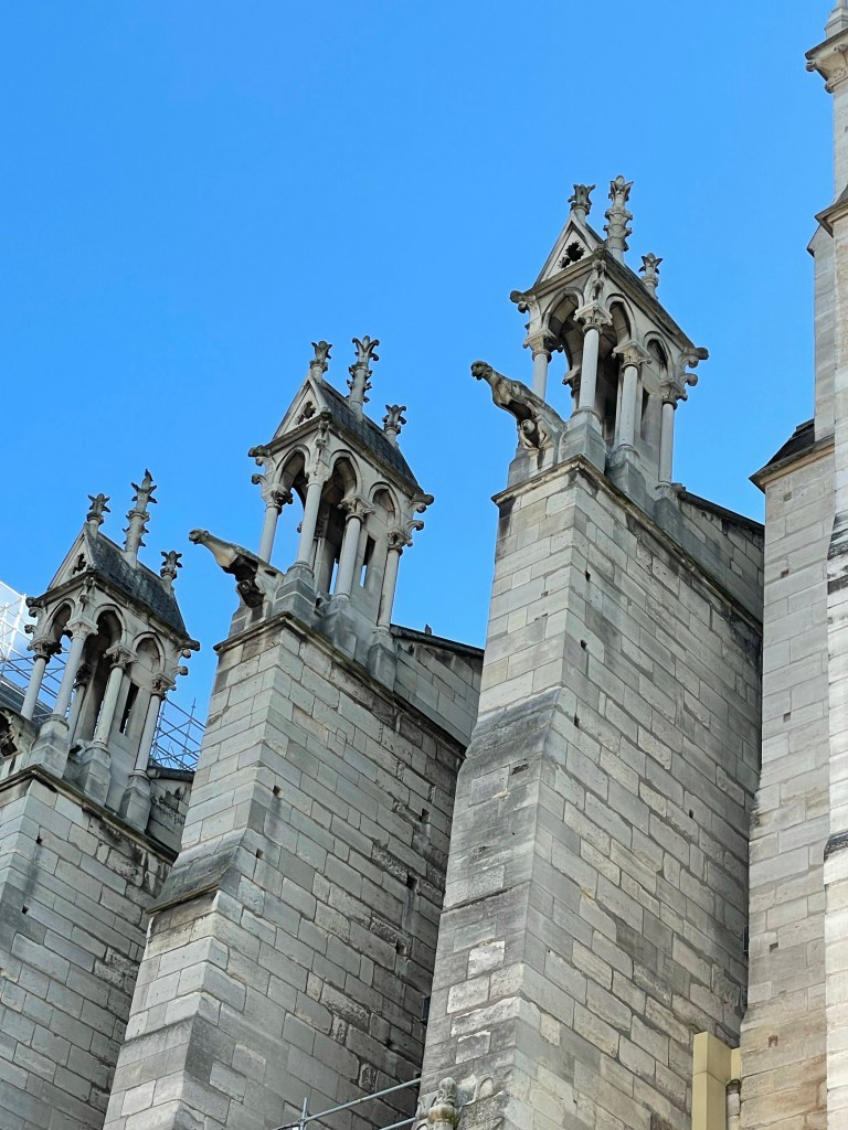 I decided to head back towards my apartment and eat at one of the little restaurants on the Ile. I had circumvented Norte Dame on my way out to get to Sainte-Chapelle but my route “home” took me right alongside it. As I walked past I marveled at the fire damage. I felt like the cathedral was violated with its exposed beams and inner stricture outwardly visible due to the damage she suffered. I was in awe staring up at the charred exterior and construction equipment deployed to put humpy dumpty back together again.