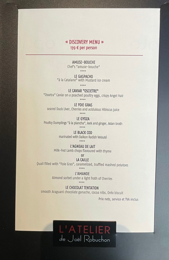 A quick refresh and I was ready to head to dinner at the Michelin starred L’Atelier de Joel Robuchon. Please note that the website footer does clarify that dogs ARE allowed. This was one of the dinners I had planned in advance and was excited for. Thankfully they have counter seating so I was able to get a reservation for one! Though one of my goals for the day had been to try to get around using a bike or scooter I decided that a walking/metro combo would be safer. Located in the swank Saint Germaine neighborhood I stood in the blazing sun outside as they took in each reservation one at a time. They only do reservations for one seating a night at 6:30pm. Elsewise you just have to roll the dice to try to get in later IF a table or seats have cleared.