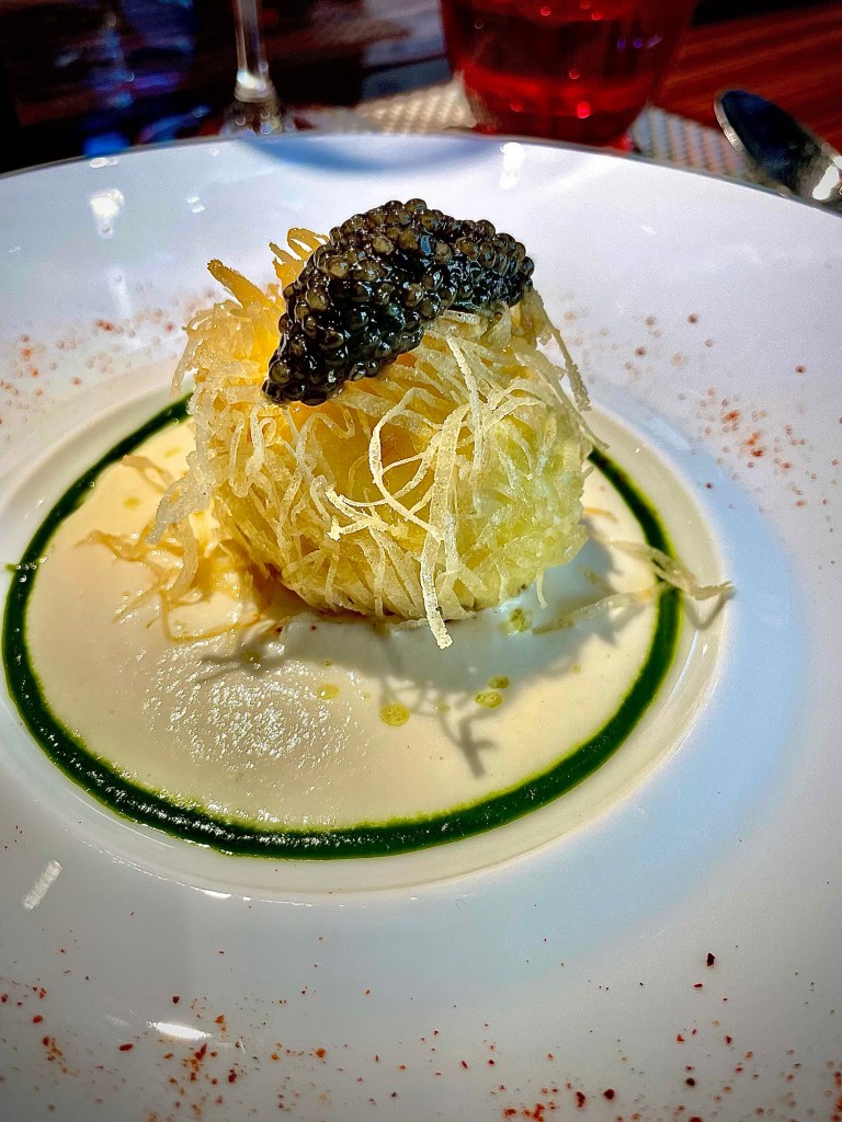 Another gazpacho was up next. This time, your classic tomato gazpacho but nothing was classic or usual about it. It was the best gazpacho (not including the melon above) I have ever had. The perfect level of acidity and balance of flavors was awe-inspiring. Following the gazpacho came the “le caviar oscietre” – caviar on a poached egg atop a cauliflower sauce. Holy yum. As I used my bread to soak up every last morsel of the sauce I thought back to years ago when I had a Board Member send another one an etiquette guide after a Board dinner – noticing he had wiped his sauce (and also tried to warm his butter with a candle but that’s another story). I thought of how poor my etiquette was in this sopping and I did not give a damn.