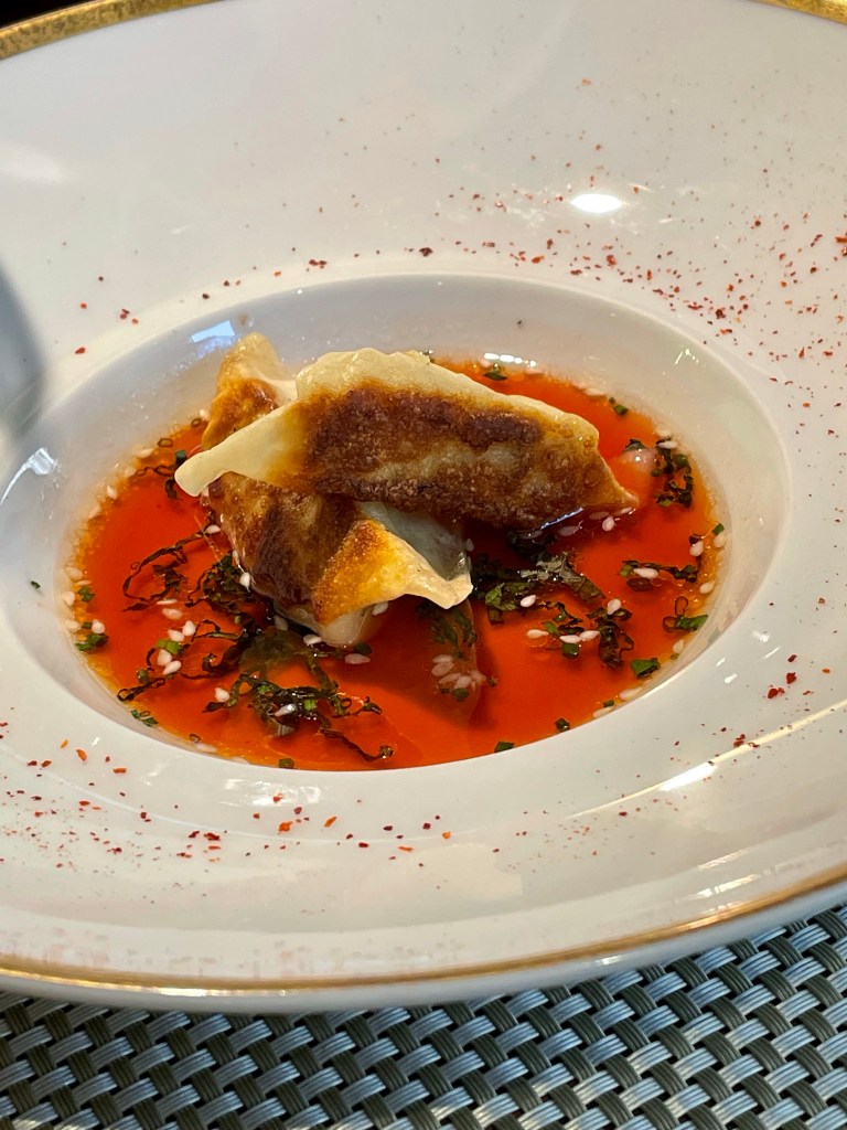 Gracing my palate next was the gyoza. Two perfect little poultry dumplings served in a light and decadent ginger leek broth. As I again made sure no sauce was left behind I was watching the kitchen and the intricacies of the chefs bringing out fresh plants from which to snip herbs and greens to grace the dishes they were preparing. I was on my second glass of Sancerre by this point and had also gone through one large bottle of water already and appreciated their attention to switch to a small bottle of water for my second as the meal was progressing. That’s one thing that I have so far loved about the French dining experience, and believe is largely attributed to their lack of reliance on tips, so far nowhere have the staff tried to up-sell or push more water, wine, etc like is often the case at home.