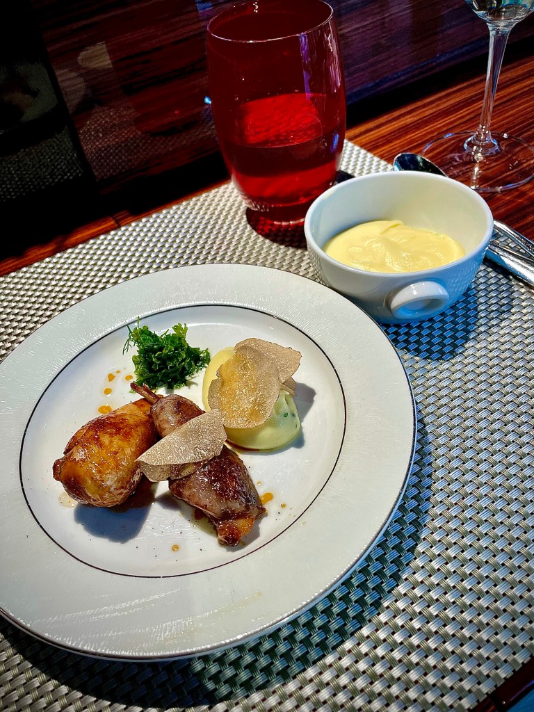 The family from Holland had already left as their a la carte dinner was over quick and another couple was seated beside me as my quail arrived. The outgoing older Parisian man said hello and introduced himself and his beautiful younger wife. I thought I saw a sideways glance from her as he introduced her around to the waiter and also to a couple on their other side, a younger set of locals. I noted how the two men struck up conversation and spent a great deal of time talking with each other, both ignoring their lovely wives. Of course, this was probably better than the couple across the counter who I hadn’t seen speak to each other, or anyone else, all night. The manager came out and Parisian the elder jumped up, apparently this was a dear friend of his. I couldn’t help but look over startled at his excitement and he explained that this manger was “the man” and in charge of all of Joel Robuchon’s restaurants. As the manager came around the counter to chat with him I noticed the elder nudging his wife on the elbow, she ignored, and he nudged again. Finally he gave up on the subtlety and put his hand on her shoulder, guiding her around to introduce his manager friend to his “wife.” This all seemed off to me, they were quite the odd couple.