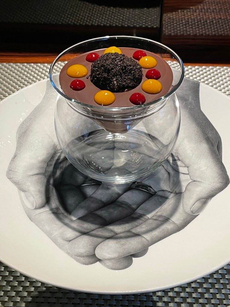 But they were nice. When their food arrived they even offered to let me taste their teeny portions since they were ordering different a la carte items. I declined because, well, that’s just weird; but it was nice. By the time I had finished my quail course it was already 8:50pm. I was almost two hours into this gastronomic delight. My first dessert, an almond sorbet with a cherry froth arrived. Alone, the cherry froth was quite tart and not too exciting, but mixed with the almond sorbet it was a perfect balance of sweet and tart. I wished I had something to scrape the last bits!