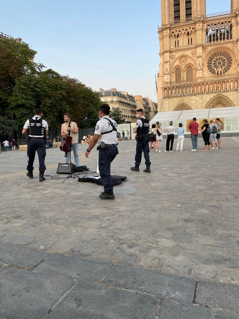 Passing by Notre Dame I did a double take as a thick French accent was singing “Mustang Sally” in the square. I laughed and muttered, “What the f*^#” and decided I needed to check this out. In the square, right in front of Notre Dame, a street performer was giving it his all. I joined the other spectators sitting on the benches before him and could not help but laugh at this juxtaposition of the gothic cathedral in the background and the terrible renditions I was hearing of classics such as “Space Cowboy,” “Stairway to Heaven,” and “Purple Rain.” The dusky lighting on the cathedral made for an awe-inspiring background. The fun ended when the police arrived. He didn’t pack up but sat down himself so it was time for me to move on.
