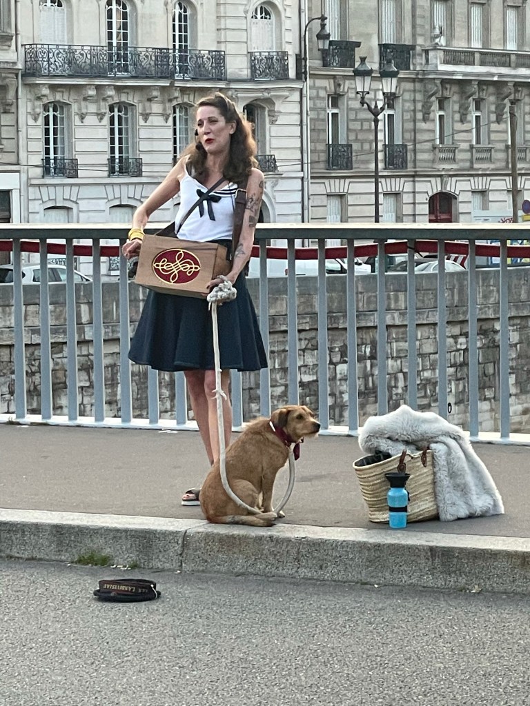 On the bridge between the two Îles another street performer belted out French classics while her dog ran amok, after he ran down the street growling and barking after three people on bikes or scooters in the course of about a minute she finally put him on a leash, that little pup earned her tips.