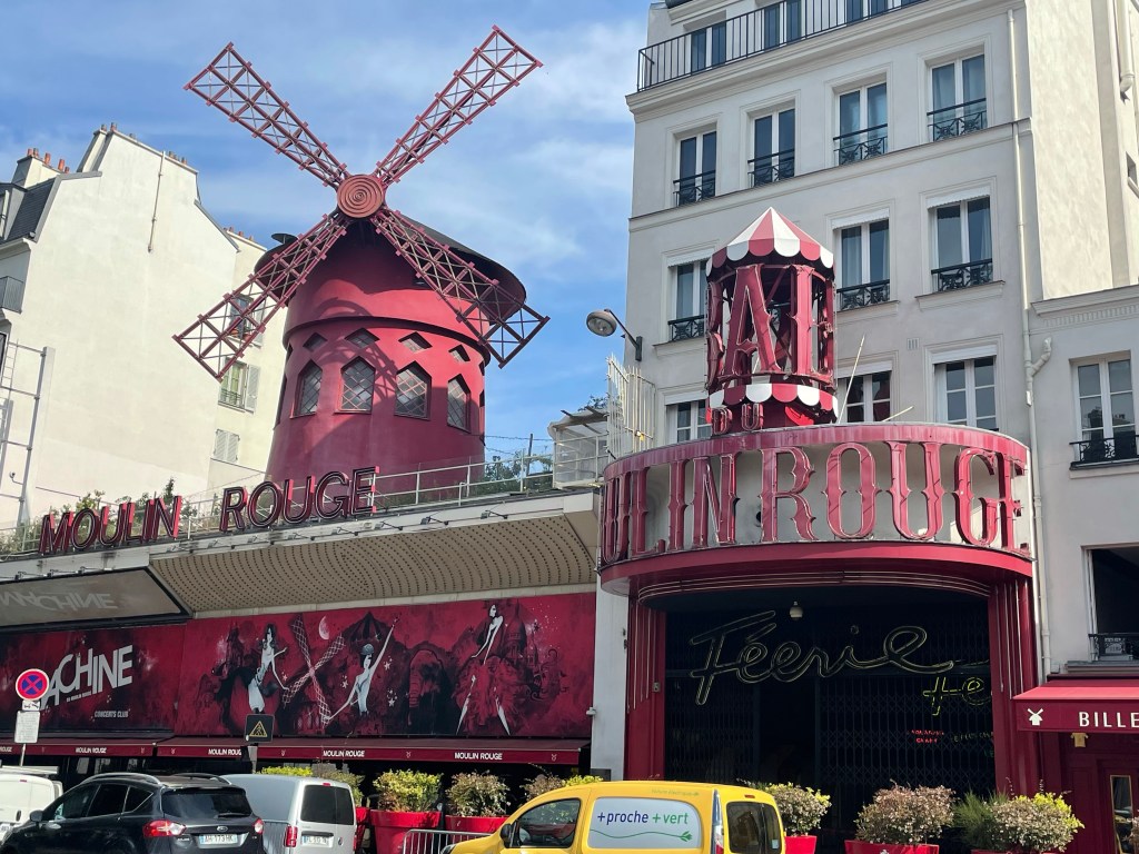 After trying on every pair of shoes I brought and all sorts of bandaid combinations to figure out which hurt my poor blistered feet the least, I was out the door. I would be walking slower today and that was ok. First stop, Montmarte neighborhood to see the Moulin Rouge, Dali Paris, and Sacre-Coeur. It took me three Metro transfers to get there and I did it, almost flawlessly, only once merely messing up when I realized I was on the wrong side of the platform. But I realized my mistake, scurried back down and back up the stairs on the other side and I was in business. The Metro dropped me off right outside of Moulin Rouge and as I ascended from the underbelly of Paris I was, well, unimpressed. Super unimpressed. It just looked like a regular theater with a windmill on top. I had expected some whimsical facade but nope.