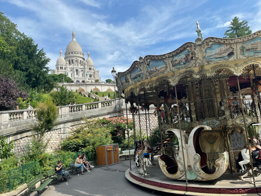 The moment I stepped off the last steep step, boom, scammers galore! I had barely made it five feet before two women rushed up asking me to sign a petition to help the prostitutes. I had been warned about this scam from friends and then subsequently read up on popular scams in Paris before my trip so I was prepared. Their play was to get people to sign a petition and while you were busy doing so the other would steal whatever they could reach off of you. They were EVERYWHERE up there! No less than seven or eight approached me in the ten minutes I was there. I got smart quick though, their opening line was “You speak English?” I would just look confused, shake my head, and keep on moving. Other scammers were selling little string bracelets to ignorant souls. They would ask “where are you from” and if you weren’t from the EU, they’d give you fake change instead of real Euros. Even I could easily tell they were basically handing out Monopoly money. This was the most touristy I’ve felt the entire trip and I was glad I had skipped the Eiffel Tower. I like to travel with a cross-body style purse so it’s not easy for someone to grab off of me but even still I held it against the front of my body with my hand the entire time I was there. Any time I’d stop to take a picture or to look up directions to my next stop I’d make sure I was standing against a wall of some sort so nobody could come up behind me. Sacre-Coeur was fine, the view was just a view of a big city and it’s not like I’m a stranger to big cities so I was perhaps less impressed than others would be. The basilica itself was impressive and beautiful with its carousel at the base but the sea of tourists and scammers really detracted from the ambience.