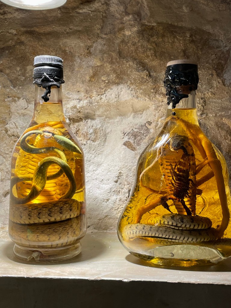 Back in the wine cave of Chef Jean-Yves, and thanks to COVID and the lack of tourists, I had a private class on how to make the perfect macaron. This was not a hands-on event but more of a sit there, drink a glass of champagne, and take notes on how he made macarons in front of me. Surprisingly, it doesn’t seem that difficult. While he went through the entire process of making the macaron itself, he didn’t spend any time at all explaining how he made the accompaniments that would adorn the plate with the delicate pastry shell and cream. When I pressed for more information the responses where short and not particularly helpful. Given how much I had paid for this workshop I couldn’t help but be disappointed. At least the end product was delicious and calories don’t matter as much when you’re walking close to 30,000 steps a day. I actually felt a little bad turning the beautiful dessert into carnage as I devoured it, sitting awkwardly alone in the cave with my glass of champagne. Looking around while I ate I did a double-take at the snake filled bottles that adorned one shelf. Armed with my goody bag of extra macaron shells I was out the door at 3pm on the dot, just as my schedule for the day had indicated.