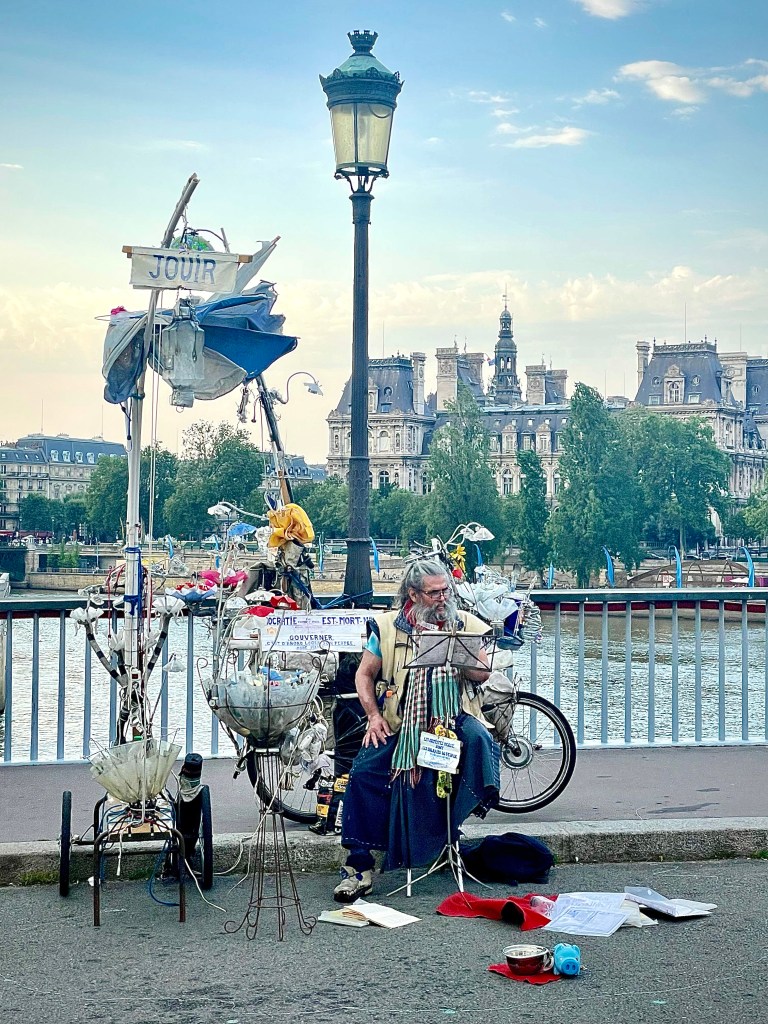 Relieved, I was ready for dinner. This evening’s street performer of choice on the bridge between Îles had quite the complex set-up, complete with water fountains. He sat on his throne reading aloud to those passing by.