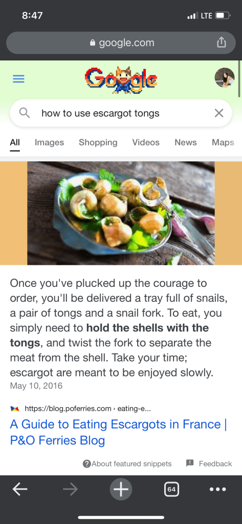 Straight up, my waiter was an asshole. He was rude and dismissive and forgot about me. I ordered a salad, escargot, and duck au poivre. The escargot was divine but it’s arrival, with the little tongs and fork, presented a little conundrum for me. Crap, how the hell are you actually supposed to use these tongs and eat these things? It’s been over 20 years since I last had escargot, at the Slocum house with my brother. We all know I have no shame so I pulled out my phone and the power of Google to guide me; and then happily dug in. The escargot were delicious, buttery, garlicky, little morsels of heaven.