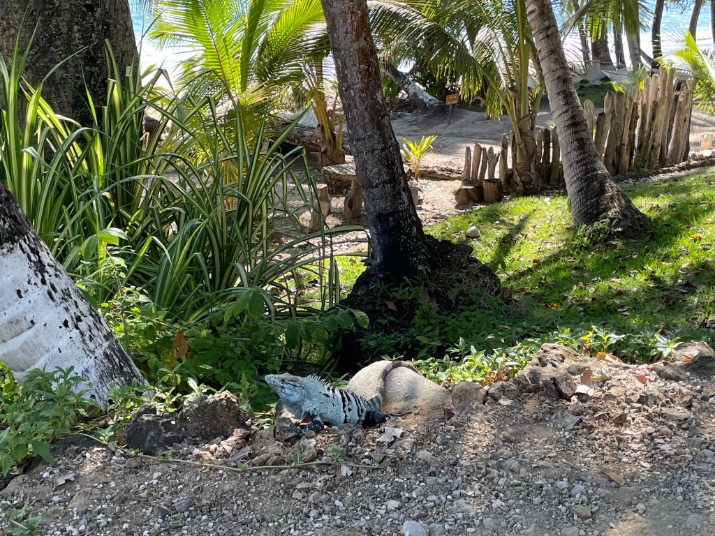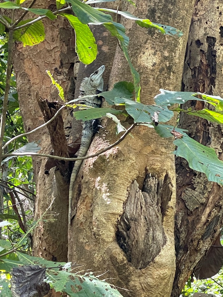 Upon check-in last night we had been provided a map showing all the features of the large and sprawling property; a lookout point, the golf course, the stables, the pools, and a waterfall. Everything was just five minutes we were told. It was already blazing hot after breakfast but we decided to walk down and check out the waterfall, the little trail we were shown would take us to the top of the waterfall and from there we could get down to the base and another beach. Since it was only five minutes away we didn’t bring anything with us, thinking if we liked the spot we’d come back and get water, towels, etc. I think they must have meant five minutes by car and we sweated away down the road. A loud ruckus on the ‘forest’ floor caught our attention and it looked like a Mohawk was running around in circles. The Mohawk ran up a tree and revealed itself to be a large white iguana, postering at us to move along from his territory.