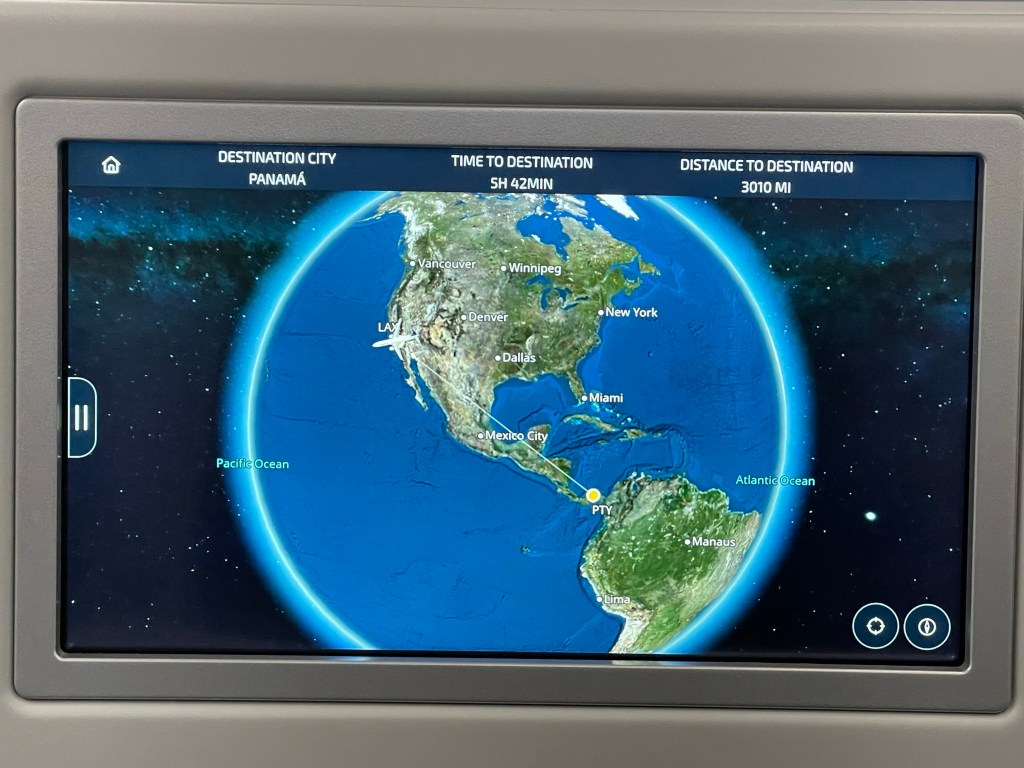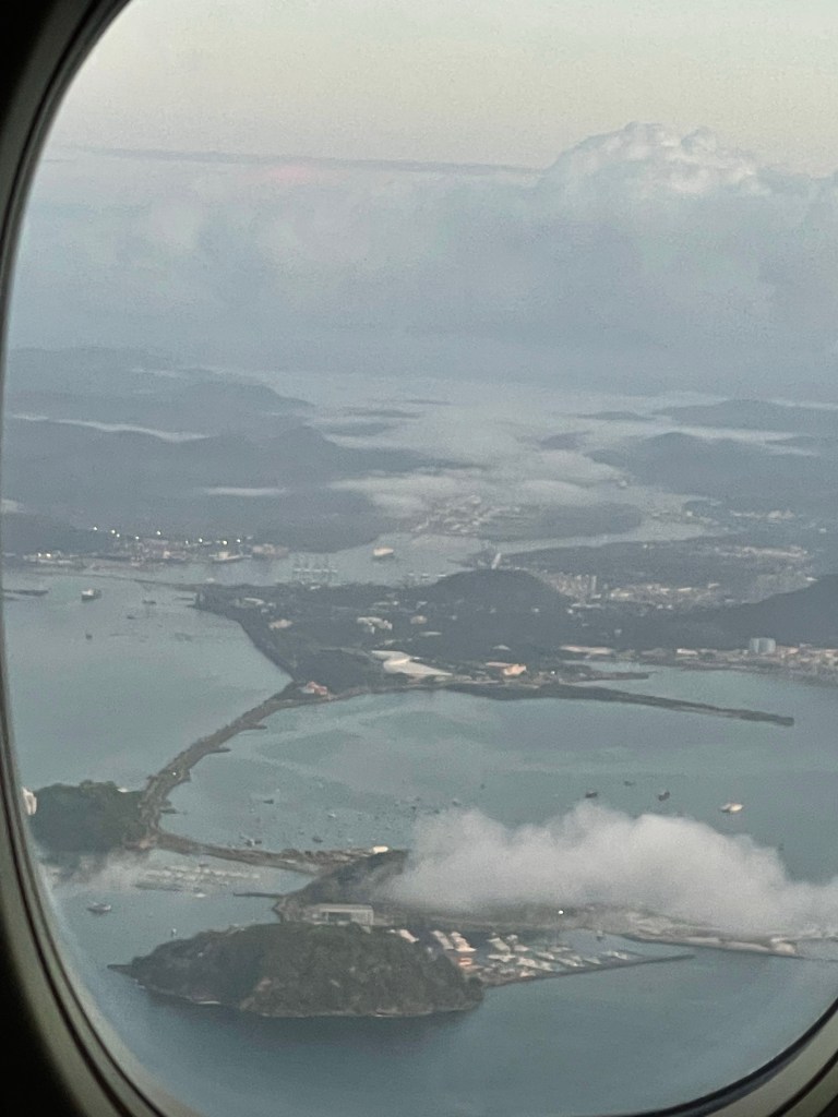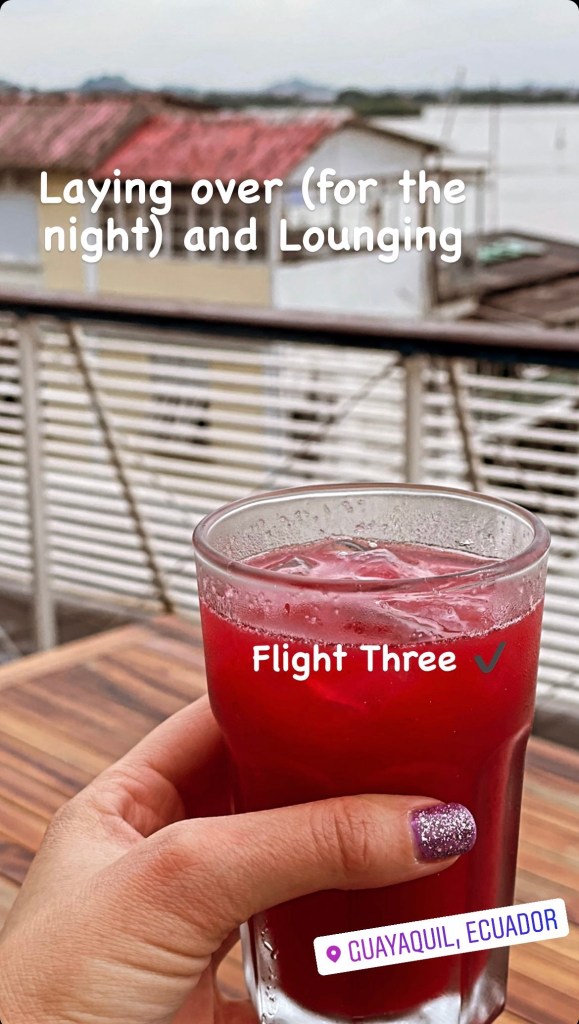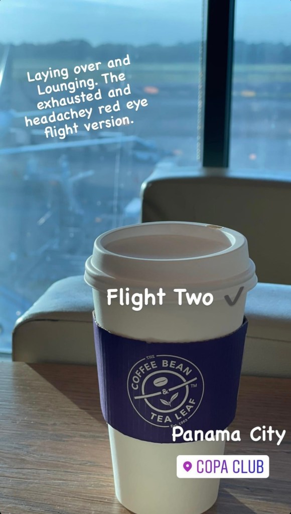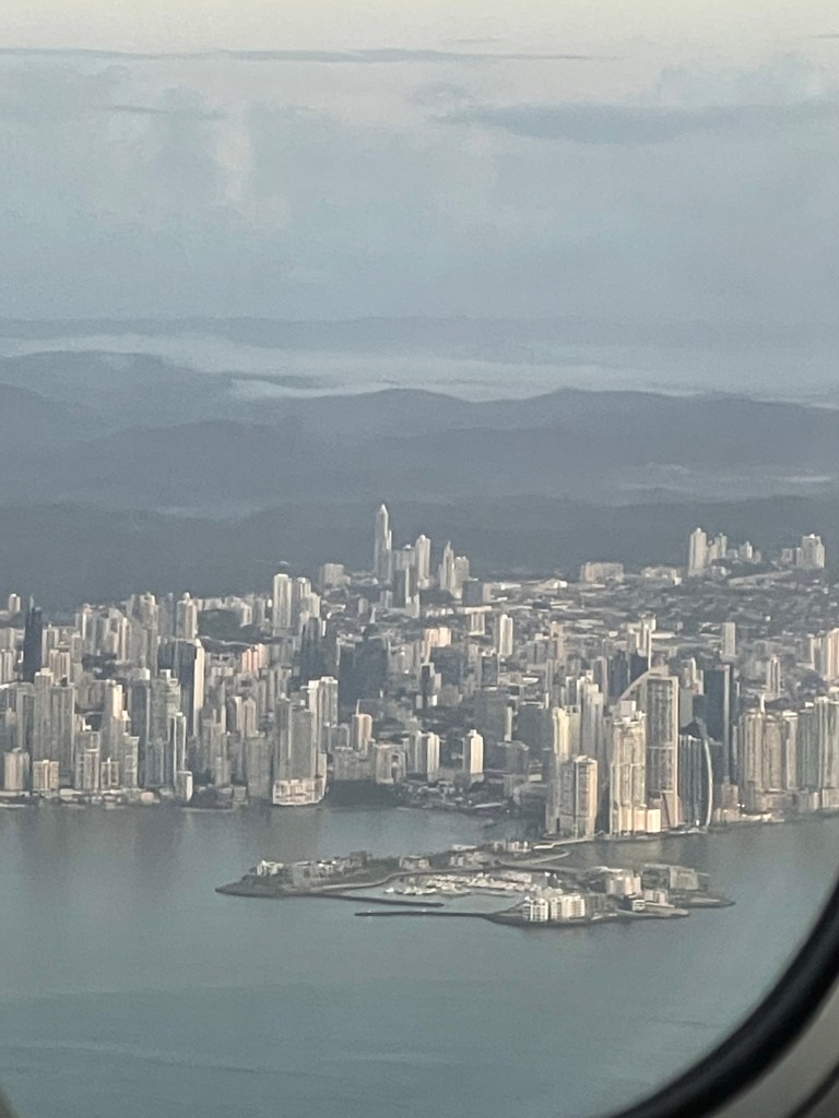 Unfortunately I also woke up with a raging headache. Thankfully, Natalie, the attentive flight attendant who wasn’t attentive enough to dim the lights at an appropriate time, had slipped a bottle of water onto my tray as I slept so I emptied a Liquid IV into it to hydrate. My German seat buddy and I chatted about eyes, I know a thing or two after all the surgeries I’ve had, and enjoyed seeing the Panama Canal and Panama City come into view. I was shocked at the massive skyscraper-filled Panama City skyline; not at all what I expected. Flight two, done!