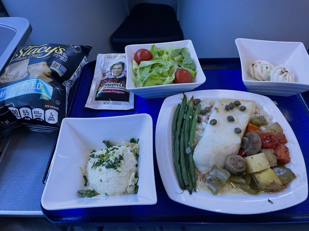 I had already taken a sleeping pill and the flight wasn’t departing until 10:16pm but I was still hungry, so I went ahead and selected the fish for dinner instead of talking a pass. And a glass of bubbles of course. The sea bass that arrived was ok, just ok. Served with vegetables, a green salad, and some random blob that I could not identify but was quite delightful. Artichoke dip? I have my money on artichoke dip but I couldn’t say for sure. That would make sense with the accompanying pita chips. As much as I wanted to devour the meringues that came for dessert I held off, consuming what is basically pure sugar would not help me get any rest. The sparkling wine was delightful and I made a FlightFud hydration drink as a chaser.
