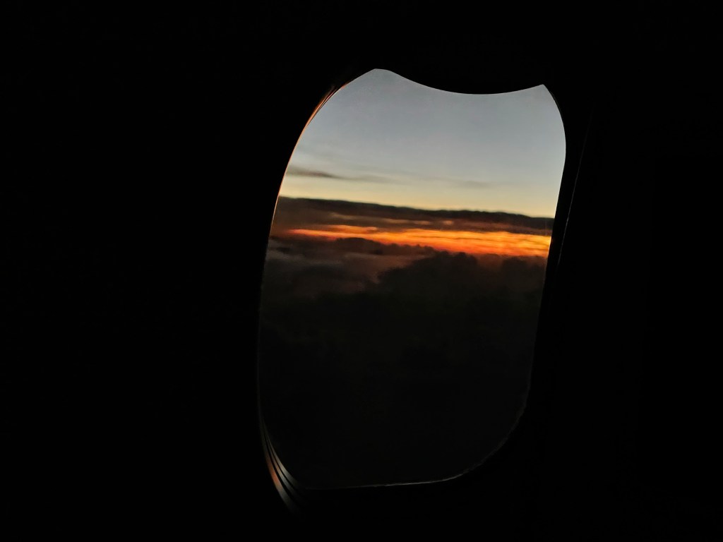 It had been about an hour since take-off, the meal was done, and there was only about 4 1/2 hours left in the flight. Time to sleep! I brushed my teeth, reclined my seat down into the lay flat bed, and snuggled into my pillow and blanket. But it was freaking bright. Like really freaking bright. They had not dimmed the cabin lights at all. I tried wearing the eye mask that came in my amenity kit, not comfortable; I tried pulling the blanket over my head, too hot. Yah, it was also hot. And the wild-haired man a row ahead was sawing logs like nobody’s business. I thought about pulling out my little travel fan to plug in but the air is dry enough in a plane my skin didn’t need that. Between the snoring, the heat, and the damn bright lights overhead I probably laid there for an hour, counting up to and back from 100 to try to lull myself to sleep. At some point, I awoke startled to realize that I had actually fallen into a real sleep. Not a deep dreaming sleep but sleep nonetheless, There was 1 1/2 hours left of the flight so I’d probably gotten a solid two hours. I closed my eyes again, waking up to an announcement that the cabin was being prepared for landing. Only half an hour to go; so apparently I snuck in another hour of sleep without realizing I had fallen asleep again. The sun was rising and through the window red blazes cut through the clouds.