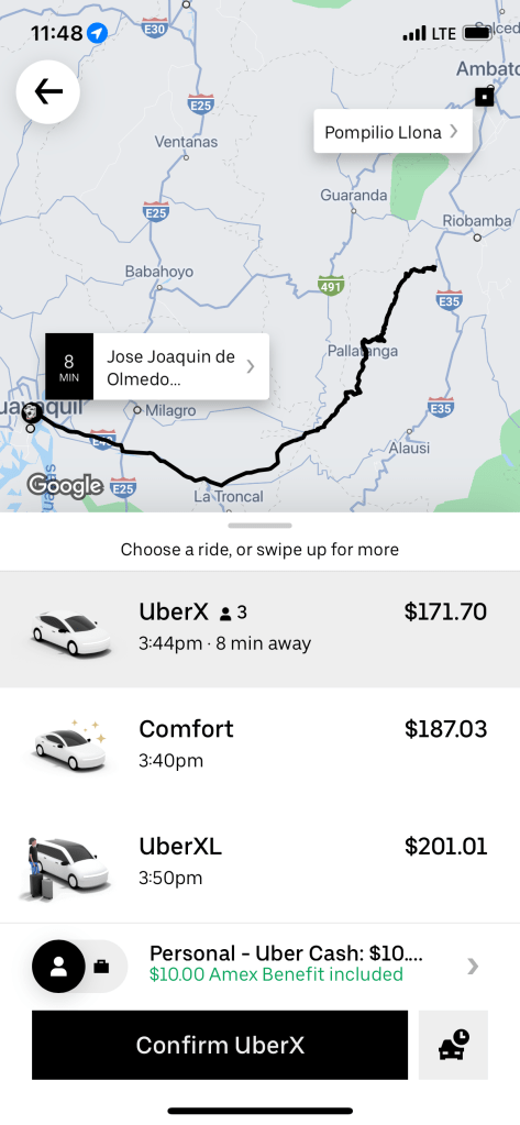 My luggage and I were reunited without hassle and, after being waved through baggage check, I stepped out of the airport into the hot, muggy air. It was like walking into a sauna. The Guayaquil airport is very nicely appointed and I stepped aside by a large koi pond to request an Uber, since I’ve been repeatedly told and read how that’s the safest mode of transportation here. I did a double-take, then a triple-take, when I saw $171.70 come up as the price for the eight minute ride. $172?! WTF?! The timing was coming up weird as well. I walked out to the line of taxis and inquired, cuanta cuesto? $5. I triple-checked that price as well before happily hopping into a yellow cab to bring me to my AirBnB. Finally realizing that my Uber snafu was user error in that four hours a way there’s a town with the same name as the street my AirBnB is on.