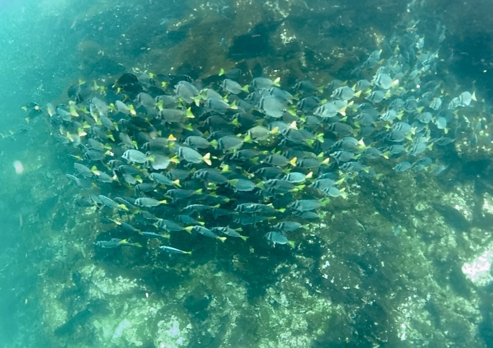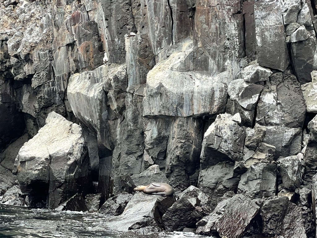 Descending back down Prince Philips steps the panga met us to take us back to the yacht. It was deep water snorkel time. Back on board everyone geared up in our wet suits and then the panga took us back near the steps and off we jumped into the water. Jumping off into the cold deep water was not easy for me; I’m not comfortable in cold or water and I didn’t have B here to catch me. Linda was seated next to me on the panga and shared my discomfort so together we made the leap into the water; it was really nice to have a new friend with which to help me get over the hump of that moment. A fur seal (technically a sea lion but they are commonly referred to as seals) lounged on a rock with his cute little face, stubbier and fuzzier than a traditional Galápagos sea lion. Fun fact: Galápagos sea lions are very closely related to the California sea lions. Also a fun fact; the snorkeling on this side of the island wasn’t very interesting. Like not at all. I gave it a good of probably 40 minutes before finally raising my hand for the panga to come get me since I was just plain bored.