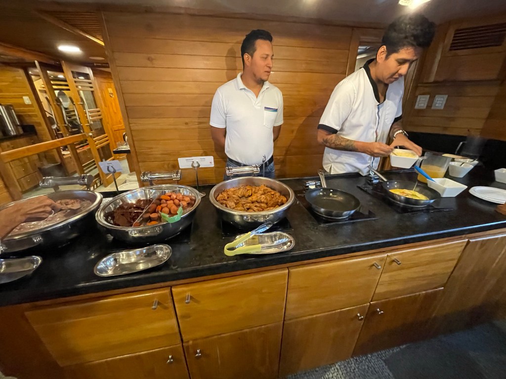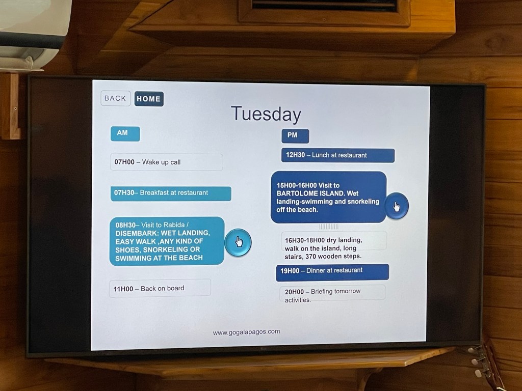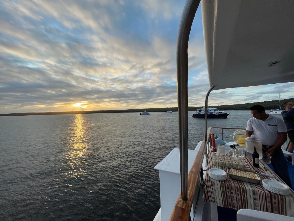 Before dinner, an announcement was made to meet in the salon for tomorrow’s briefing. Tomorrow will be quite a full day. In the morning we will take all our snorkel gear with us to visit Rabida where we will have a wet landing before a hike and a snorkel. Rabida was the island I had been most excited to visit due to the unusual red sand beach. In fact, the entire island was red. I had specifically searched out a cruise itinerary that included Rabida because it seemed so unique. In the afternoon, we will visit Bartolome Island where we will have a wet landing and snorkeling. Then we will go back to the yacht to dry off and change. Then back to Bartolome for a hike to the lookout. The hike will consist of 370 steps along the wooden plank trail. “We need to burn our calories. I know we need to because we eat a lot,” Billy explained. After the hike we will take a panga ride along the shore line to safari for more marine life sightings.