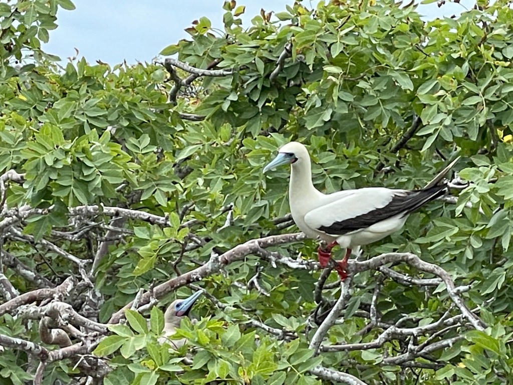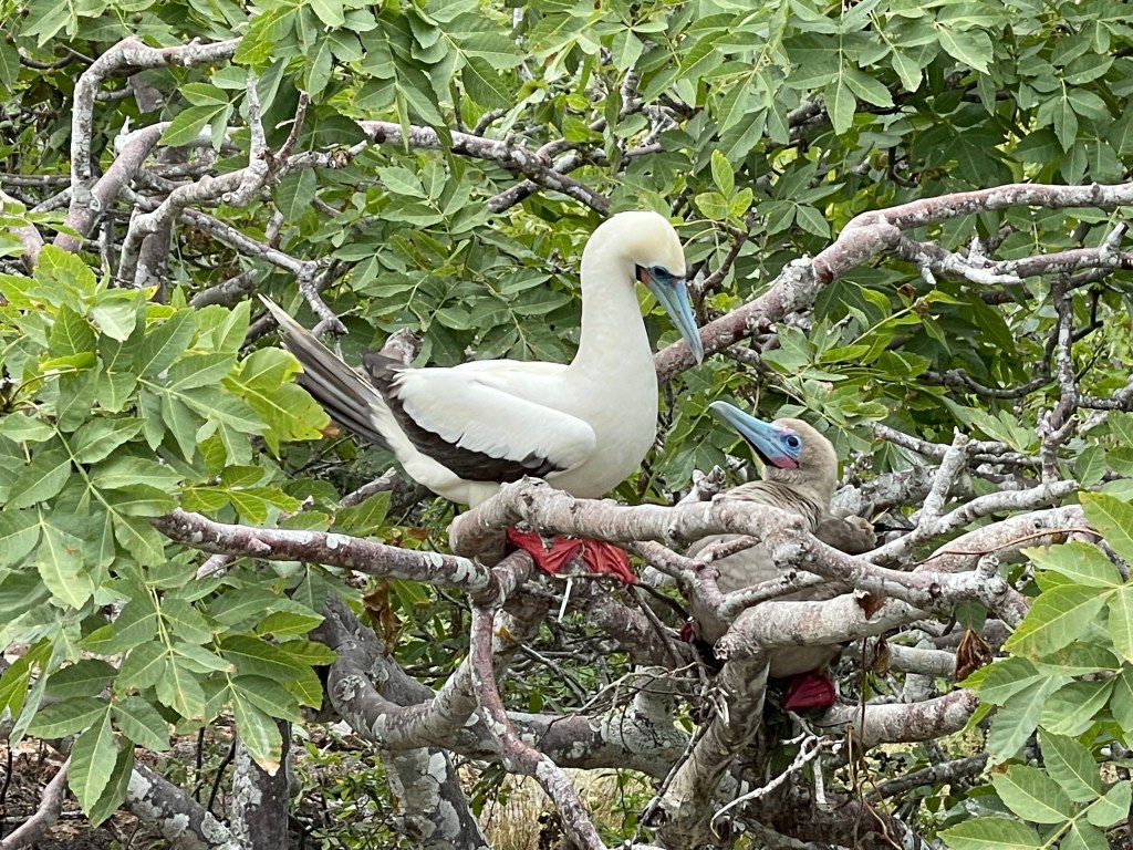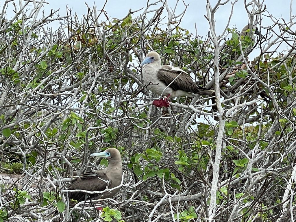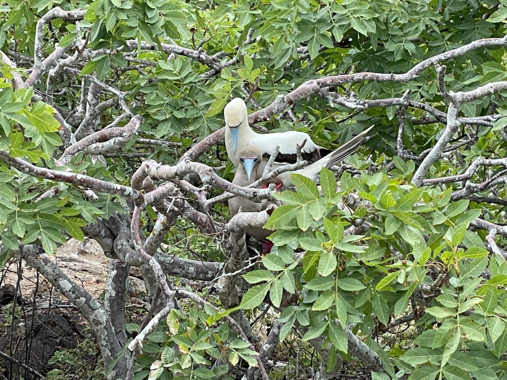 Red-footed boobies perched in trees, showing off their bright feet; some brown feathers, some white. While the masked boobies make a poop circle and lay their eggs on the ground within a poop circle the red-footed boobies nested in trees. On another tree one brown and one white red-footed boobie were staring longingly into each other’s eyes; “It looks like they are having a first date!” Andreas quipped. A few seconds later this date was taken to the next level as white boobie hopped upon the brown and they put on a mating show in front of us. I had just caught boobie porn on video! It’s rare for the different colored birds to cross-mate but it occasionally happens; with the brown color a more dominant gene. Later on the hike we actually spotted a hybrid between a brown and white; it was a beautiful marbled mocha. The red-footed boobies were gorgeous birds with their iridescent blue beaks, puffy feathers, and flamboyant feet.