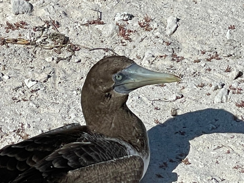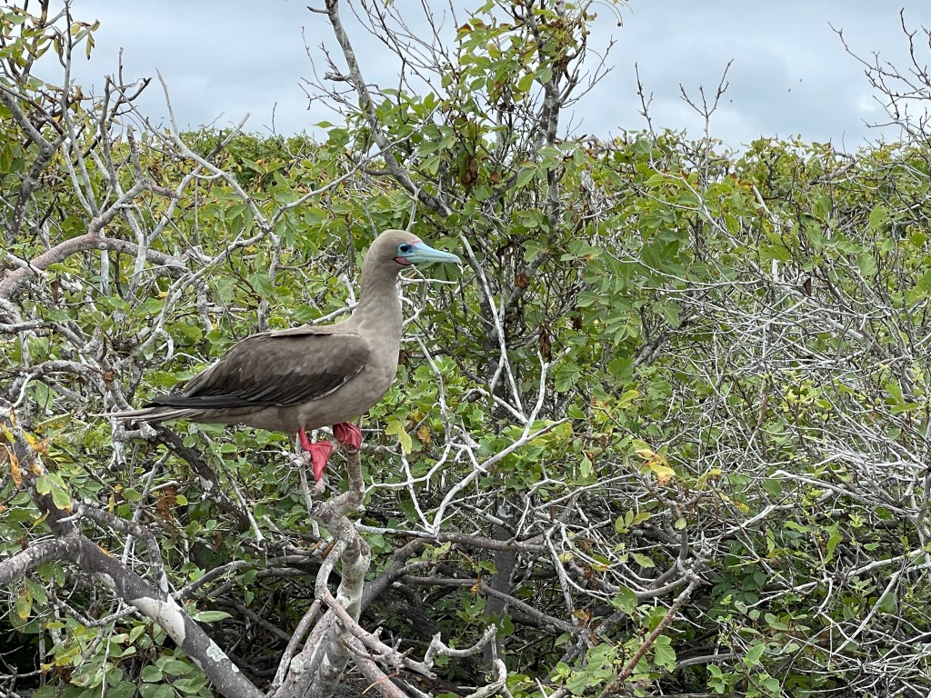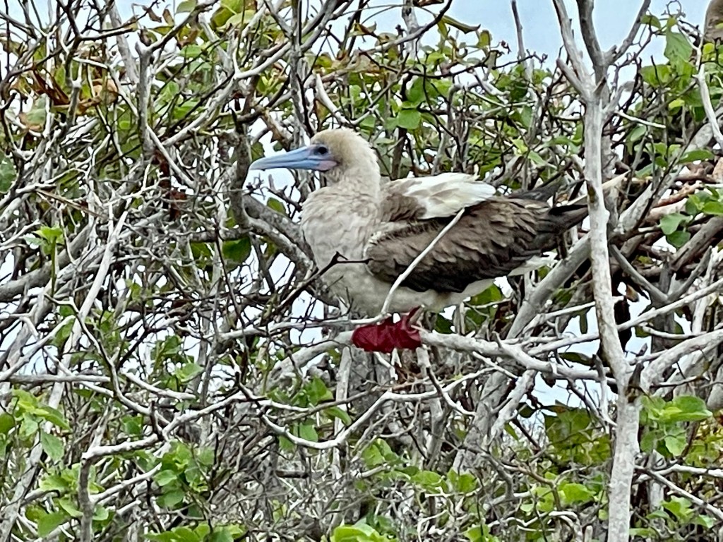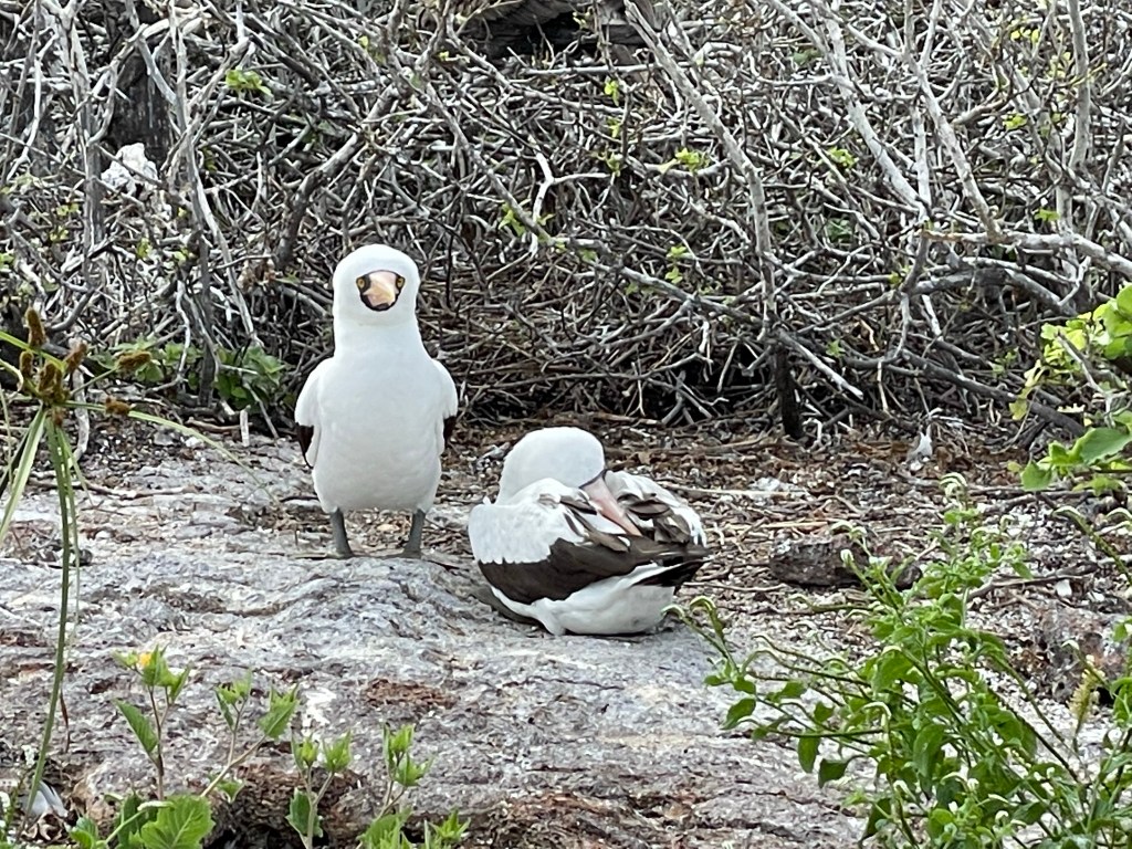 Red-footed boobies perched in trees, showing off their bright feet; some brown feathers, some white. While the masked boobies make a poop circle and lay their eggs on the ground within a poop circle the red-footed boobies nested in trees. On another tree one brown and one white red-footed boobie were staring longingly into each other’s eyes; “It looks like they are having a first date!” Andreas quipped. A few seconds later this date was taken to the next level as white boobie hopped upon the brown and they put on a mating show in front of us. I had just caught boobie porn on video! It’s rare for the different colored birds to cross-mate but it occasionally happens; with the brown color a more dominant gene. Later on the hike we actually spotted a hybrid between a brown and white; it was a beautiful marbled mocha. The red-footed boobies were gorgeous birds with their iridescent blue beaks, puffy feathers, and flamboyant feet.